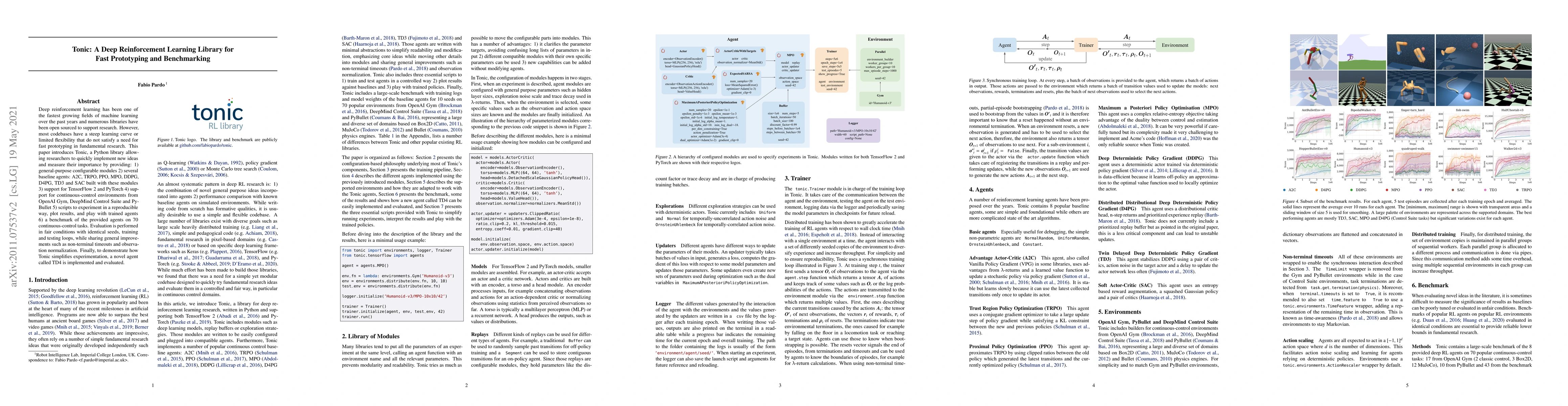 Tonic is a Python deep reinforcement learning library designed for fast prototyping and benchmarking, offering configurable modules, multiple baseline agents, and support for TensorFlow 2 and PyTorch, along with a benchmark of agents across 70 continuous-control tasks. It simplifies experimentation with continuous environments and includes scripts for reproducible results and agent evaluation.