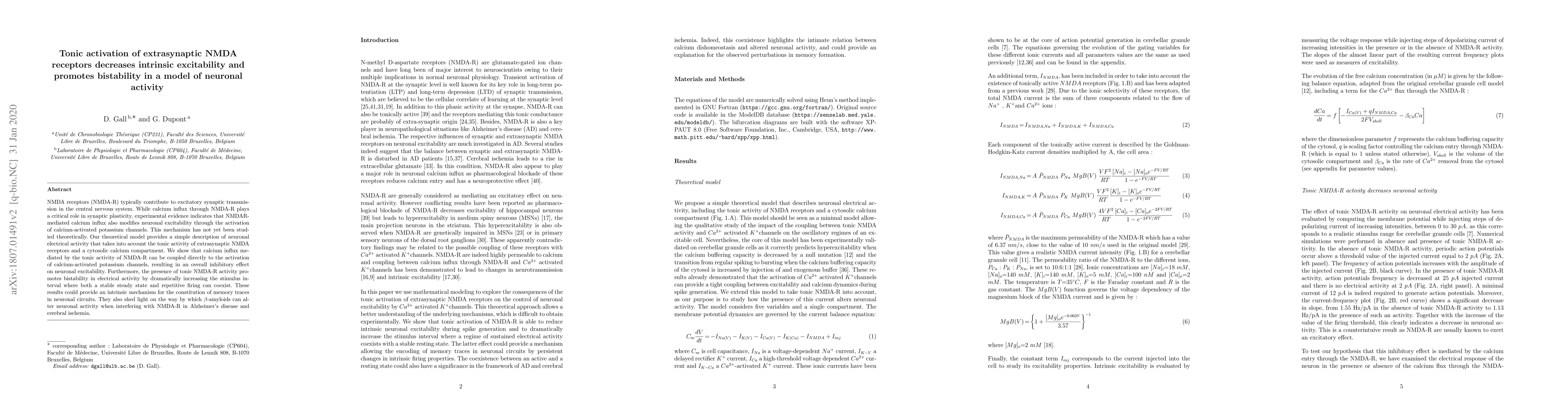 This research demonstrates that tonic activation of extrasynaptic NMDA receptors inhibits neuronal excitability and promotes bistability in neuronal activity, potentially explaining mechanisms underlying memory formation and the effects of NMDA receptor interference in Alzheimer's disease and cerebral ischemia.