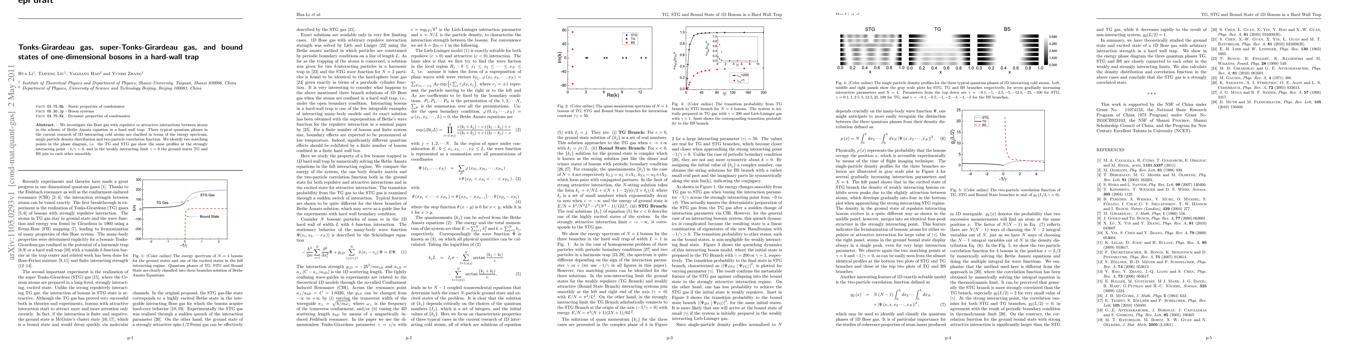 We investigate the Bose gas with repulsive or attractive interactions between atoms in the scheme of Bethe Ansatz equation in a hard wall trap. Three typical quantum phases in the current research of 1D interacting cold atoms are clarified in terms of the energy spectrum, single particle density distribution and two-particle correlation function. We identify two matching points in the phase diagram, i.e. the TG and STG gas show the same profiles at the strongly interacting point $-1/\gamma=0$, and in the weakly interacting limit $\gamma=0$ the ground states TG and BS join to each other smoothly.