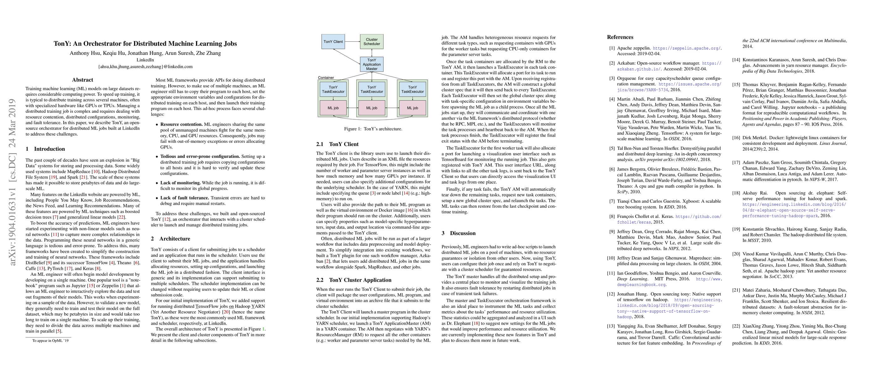 Training machine learning (ML) models on large datasets requires considerable computing power. To speed up training, it is typical to distribute training across several machines, often with specialized hardware like GPUs or TPUs. Managing a distributed training job is complex and requires dealing with resource contention, distributed configurations, monitoring, and fault tolerance. In this paper, we describe TonY, an open-source orchestrator for distributed ML jobs built at LinkedIn to address these challenges.