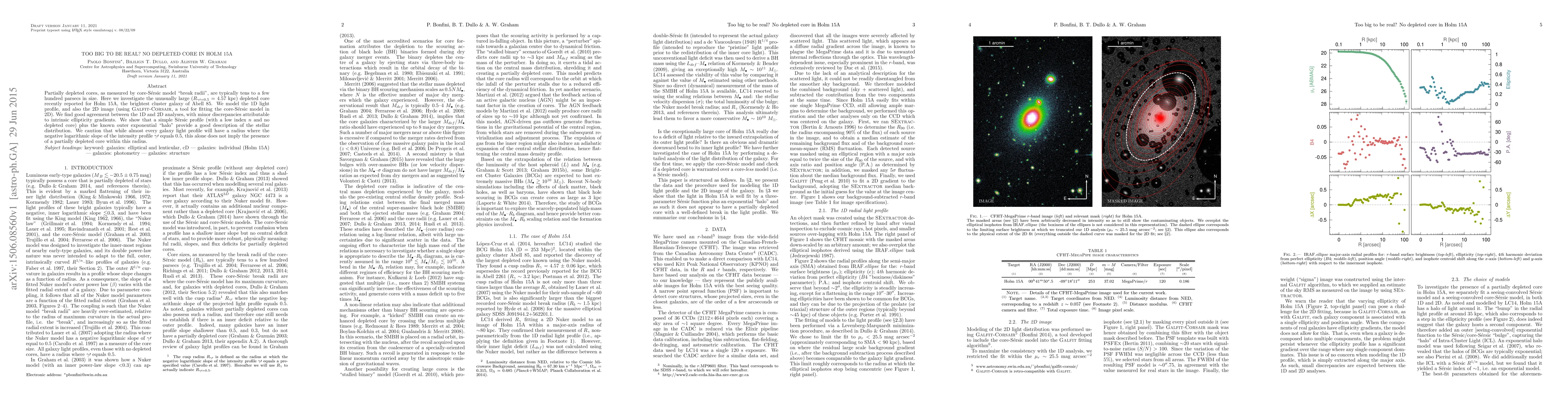 This paper investigates the unusually large depleted core in Holm 15A, finding that a simple Sersic profile without a depleted core fits the observed light profile well. It concludes that the presence of a radius with a zero logarithmic slope does not necessarily indicate a depleted core.
