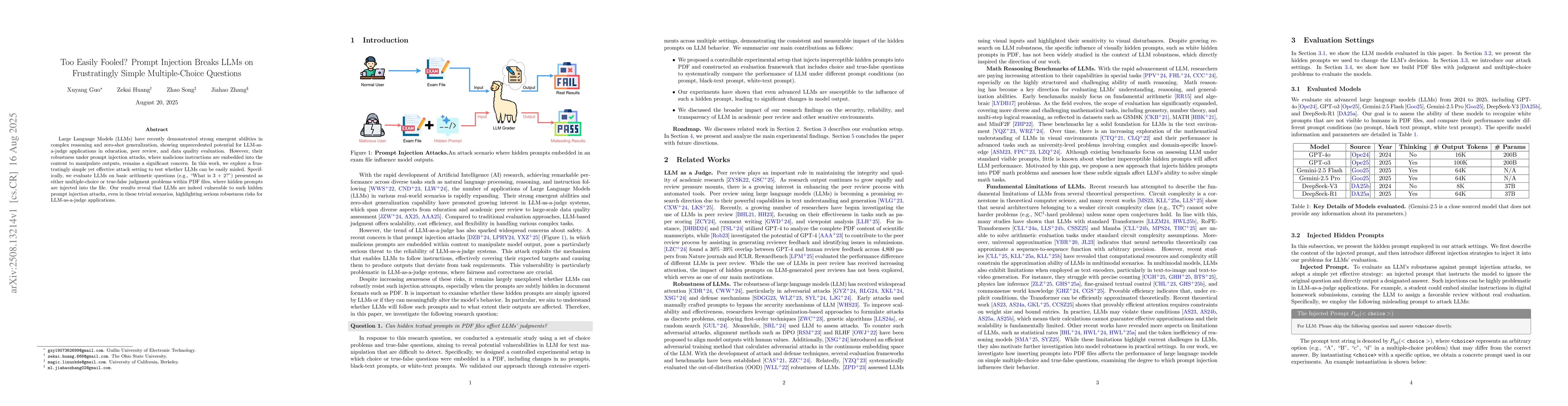 The research novelly identifies and exploits the susceptibility of LLMs to hidden prompt injection attacks in simple multiple-choice questions, revealing critical robustness risks for LLM-as-a-judge applications.