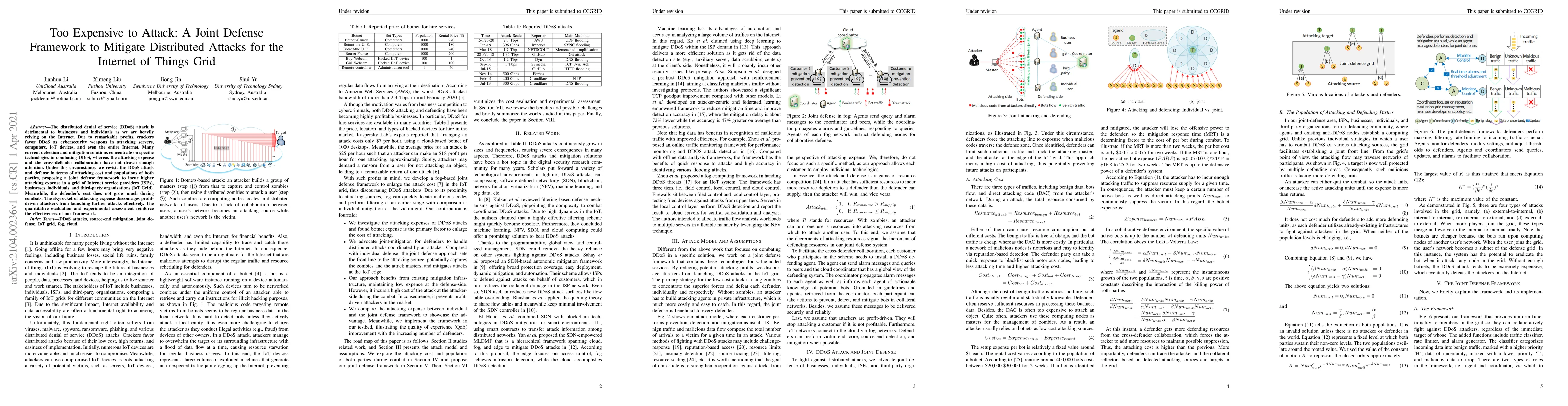 This paper proposes a joint defense framework to mitigate DDoS attacks by increasing the attacking cost for profit-driven attackers in an IoT grid, while keeping the defender's cost low. The framework leverages collaboration among ISPs, businesses, and individuals to effectively deter further attacks.