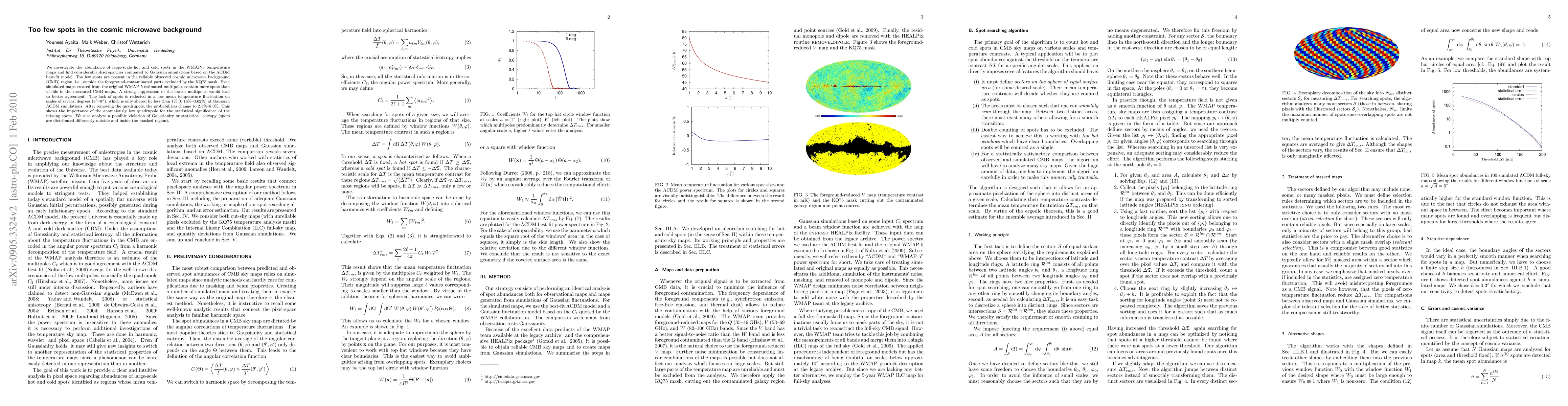 We investigate the abundance of large-scale hot and cold spots in the WMAP-5 temperature maps and find considerable discrepancies compared to Gaussian simulations based on the LCDM best-fit model. Too few spots are present in the reliably observed cosmic microwave background (CMB) region, i.e., outside the foreground-contaminated parts excluded by the KQ75 mask. Even simulated maps created from the original WMAP-5 estimated multipoles contain more spots than visible in the measured CMB maps. A strong suppression of the lowest multipoles would lead to better agreement. The lack of spots is reflected in a low mean temperature fluctuation on scales of several degrees (4 to 8), which is only shared by less than 1% (0.16%-0.62%) of Gaussian LCDM simulations. After removing the quadrupole, the probabilities change to 2.5%-8.0%. This shows the importance of the anomalously low quadrupole for the statistical significance of the missing spots. We also analyze a possible violation of Gaussianity or statistical isotropy (spots are distributed differently outside and inside the masked region).