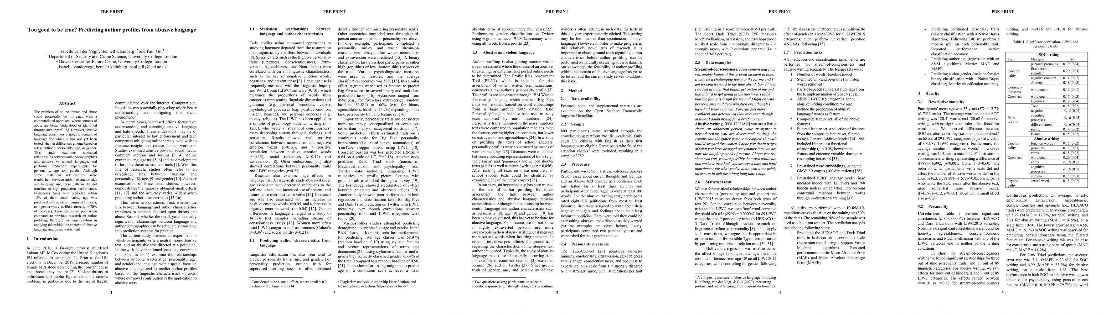 This study investigates whether author demographics correlate with abusive language online, finding limited predictive power for personality, age, and gender. Despite some statistical relationships, predictions were poor, suggesting caution in using such profiling for threat assessment.