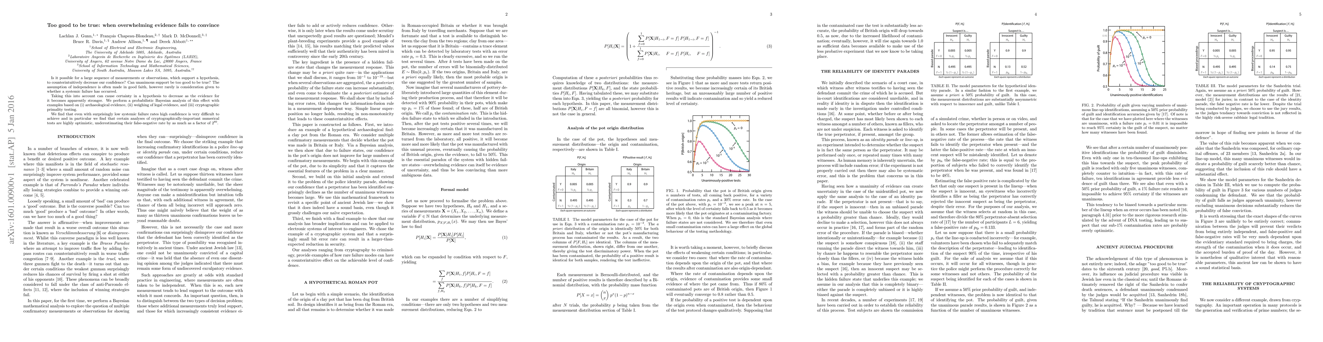 The paper uses probabilistic Bayesian analysis to examine the effect of systemic failure on confidence in a hypothesis, with examples from archaeological evidence, legal evidence weighing, and cryptographic primality testing.