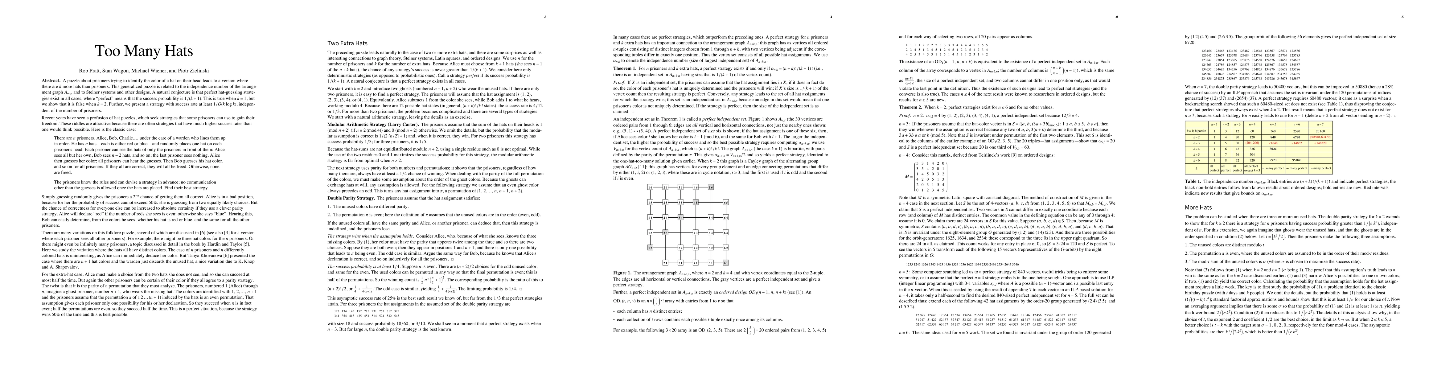 A puzzle about prisoners trying to identify the color of a hat on their head leads to a version where there are k more hats than prisoners. This generalized puzzle is related to the independence number of the arrangement graph A(m, n) and to Steiner systems and other designs. A natural conjecture is that perfect hat-guessing strategies exist in all cases, where "perfect" means that the success probability is 1/(k+1). This is true when k = 1, but we show that it is false when k = 2. Further, we present a strategy with success rate at least 1/O(k log k), independent of the number of prisoners.