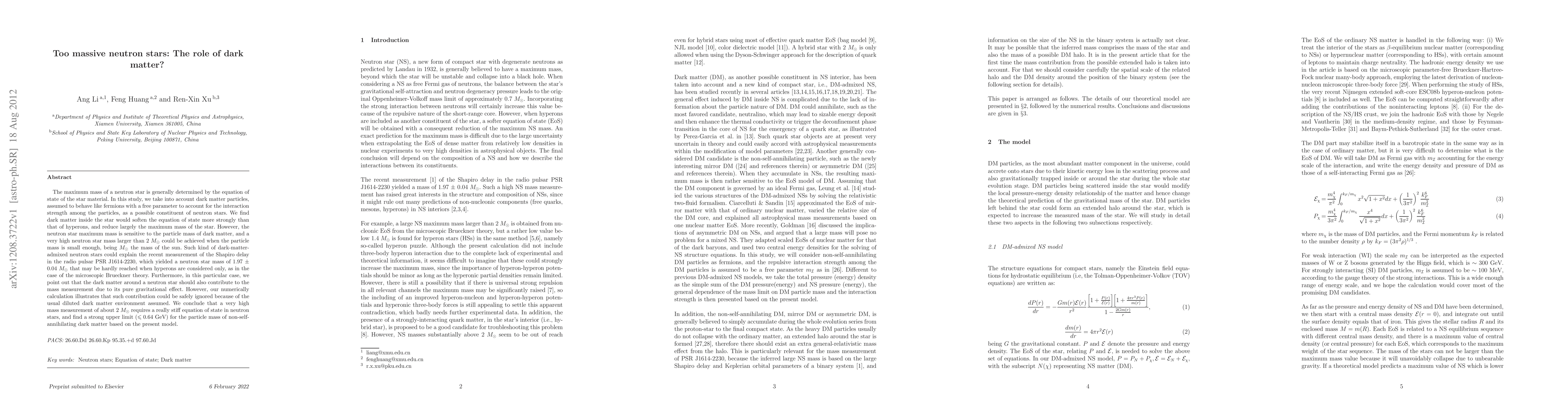 The maximum mass of a neutron star is generally determined by the equation of state of the star material. In this study, we take into account dark matter particles, assumed to behave like fermions with a free parameter to account for the interaction strength among the particles, as a possible constituent of neutron stars. We find dark matter inside the star would soften the equation of state more strongly than that of hyperons, and reduce largely the maximum mass of the star. However, the neutron star maximum mass is sensitive to the particle mass of dark matter, and a very high neutron star mass larger than 2 times solar mass could be achieved when the particle mass is small enough. Such kind of dark-matter- admixed neutron stars could explain the recent measurement of the Shapiro delay in the radio pulsar PSR J1614-2230, which yielded a neutron star mass of 2 times solar mass that may be hardly reached when hyperons are considered only, as in the case of the microscopic Brueckner theory. Furthermore, in this particular case, we point out that the dark matter around a neutron star should also contribute to the mass measurement due to its pure gravitational effect. However, our numerically calculation illustrates that such contribution could be safely ignored because of the usual diluted dark matter environment assumed. We conclude that a very high mass measurement of about 2 times solar mass requires a really stiff equation of state in neutron stars, and find a strong upper limit (<= 0.64 GeV) for the particle mass of non-self- annihilating dark matter based on the present model.