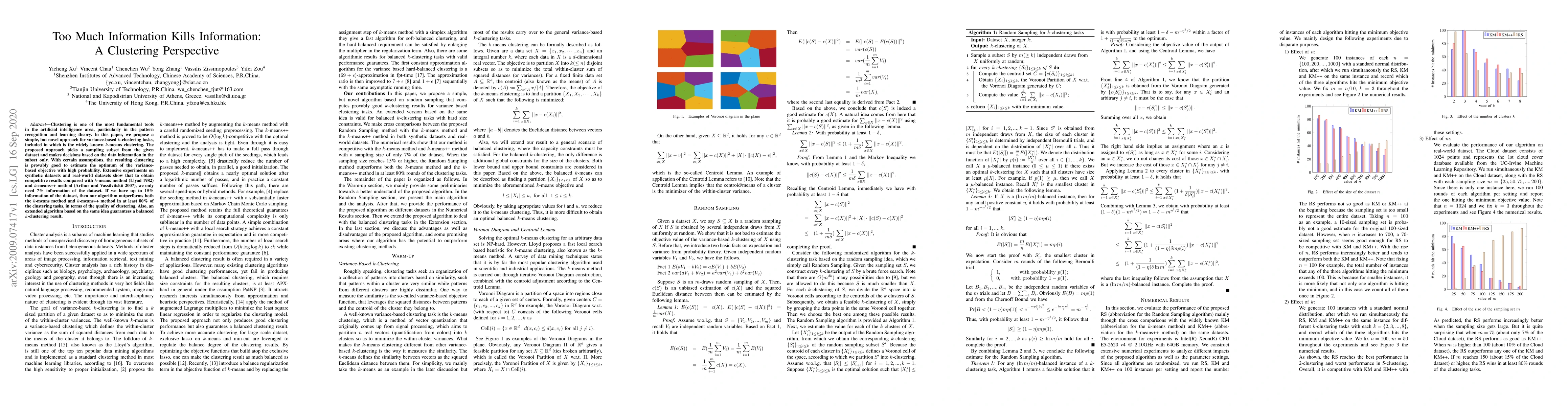 Clustering is one of the most fundamental tools in the artificial intelligence area, particularly in the pattern recognition and learning theory. In this paper, we propose a simple, but novel approach for variance-based k-clustering tasks, included in which is the widely known k-means clustering. The proposed approach picks a sampling subset from the given dataset and makes decisions based on the data information in the subset only. With certain assumptions, the resulting clustering is provably good to estimate the optimum of the variance-based objective with high probability. Extensive experiments on synthetic datasets and real-world datasets show that to obtain competitive results compared with k-means method (Llyod 1982) and k-means++ method (Arthur and Vassilvitskii 2007), we only need 7% information of the dataset. If we have up to 15% information of the dataset, then our algorithm outperforms both the k-means method and k-means++ method in at least 80% of the clustering tasks, in terms of the quality of clustering. Also, an extended algorithm based on the same idea guarantees a balanced k-clustering result.
