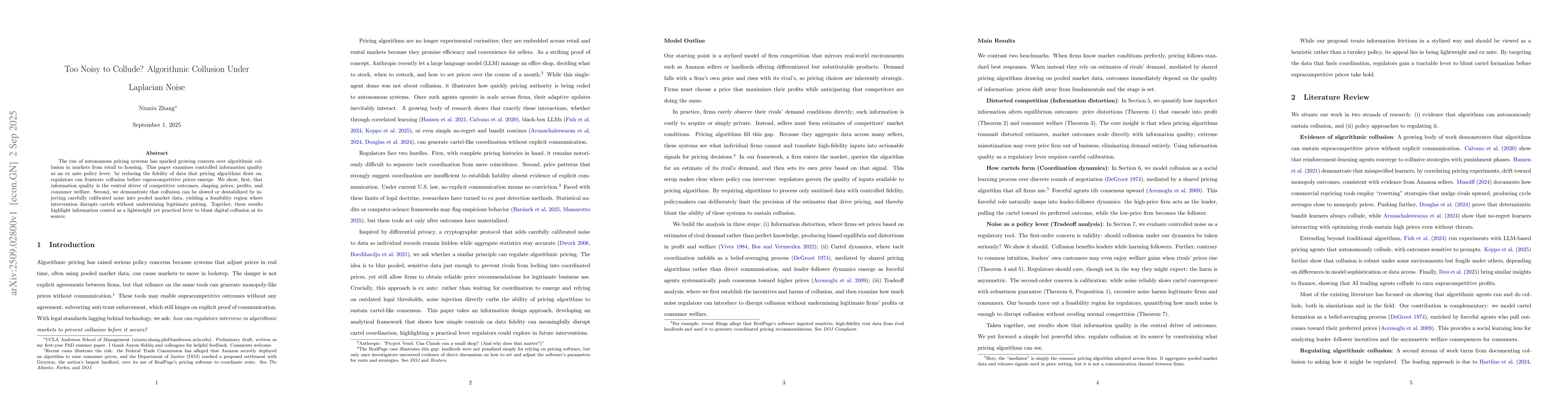 The rise of autonomous pricing systems has sparked growing concern over algorithmic collusion in markets from retail to housing. This paper examines controlled information quality as an ex ante policy lever: by reducing the fidelity of data that pricing algorithms draw on, regulators can frustrate collusion before supracompetitive prices emerge. We show, first, that information quality is the central driver of competitive outcomes, shaping prices, profits, and consumer welfare. Second, we demonstrate that collusion can be slowed or destabilized by injecting carefully calibrated noise into pooled market data, yielding a feasibility region where intervention disrupts cartels without undermining legitimate pricing. Together, these results highlight information control as a lightweight yet practical lever to blunt digital collusion at its source.