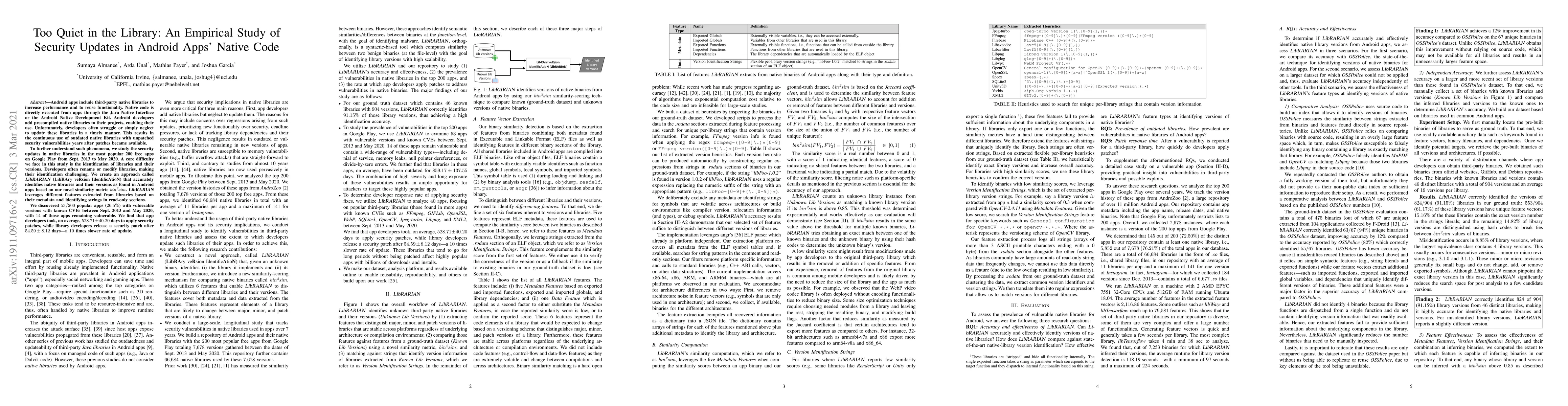 This study investigates the timeliness of security updates in native libraries used in popular Android apps, revealing that 26.5% of the 200 analyzed apps had vulnerable versions over a 7-year period. The researchers developed LibRARIAN to identify and track these libraries, finding that developers update libraries at a significantly slower rate than library maintainers.