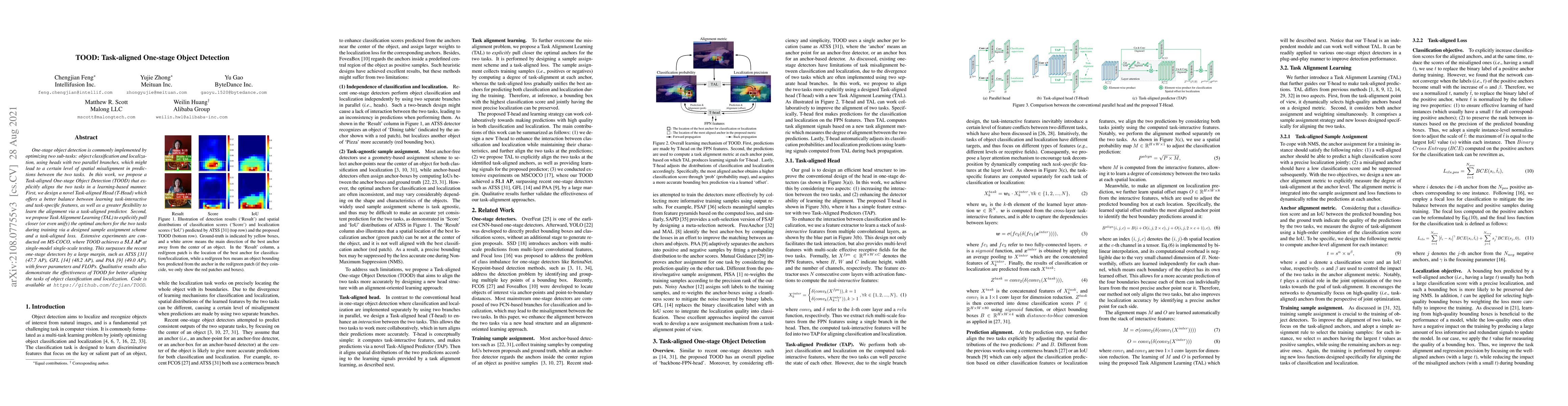 One-stage object detection is commonly implemented by optimizing two sub-tasks: object classification and localization, using heads with two parallel branches, which might lead to a certain level of spatial misalignment in predictions between the two tasks. In this work, we propose a Task-aligned One-stage Object Detection (TOOD) that explicitly aligns the two tasks in a learning-based manner. First, we design a novel Task-aligned Head (T-Head) which offers a better balance between learning task-interactive and task-specific features, as well as a greater flexibility to learn the alignment via a task-aligned predictor. Second, we propose Task Alignment Learning (TAL) to explicitly pull closer (or even unify) the optimal anchors for the two tasks during training via a designed sample assignment scheme and a task-aligned loss. Extensive experiments are conducted on MS-COCO, where TOOD achieves a 51.1 AP at single-model single-scale testing. This surpasses the recent one-stage detectors by a large margin, such as ATSS (47.7 AP), GFL (48.2 AP), and PAA (49.0 AP), with fewer parameters and FLOPs. Qualitative results also demonstrate the effectiveness of TOOD for better aligning the tasks of object classification and localization. Code is available at https://github.com/fcjian/TOOD.