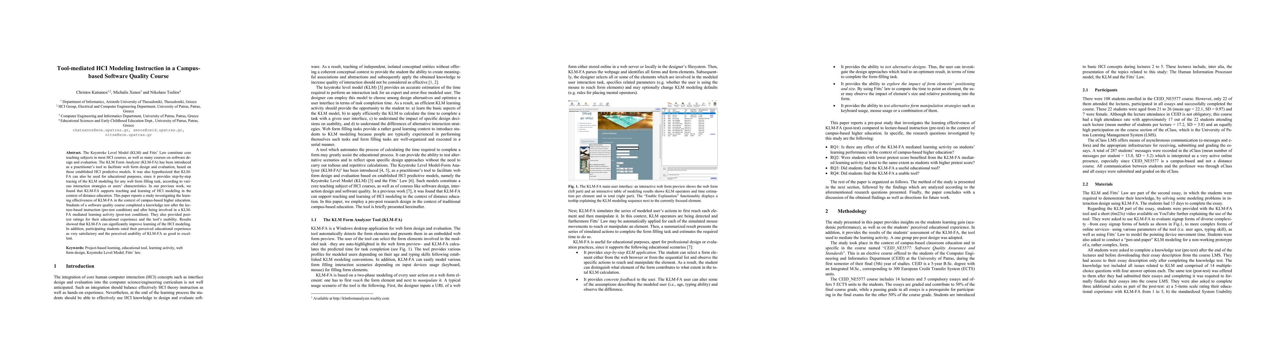 The Keystroke Level Model (KLM) and Fitts Law constitute core teaching subjects in most HCI courses, as well as many courses on software design and evaluation. The KLM Form Analyzer (KLM_FA) has been introduced as a practitioner s tool to facilitate web form design and evaluation, based on these established HCI predictive models. It was also hypothesized that KLMFA can also be used for educational purposes, since it provides step by step tracing of the KLM modeling for any web form filling task, according to various interaction strategies or users characteristics. In our previous work, we found that KLM-FA supports teaching and learning of HCI modeling in the context of distance education. This paper reports a study investigating the learning effectiveness of KLM-FA in the context of campus-based higher education. Students of a software quality course completed a knowledge test after the lecture- based instruction (pre-test condition) and after being involved in a KLMFA mediated learning activity (post-test condition). They also provided posttest ratings for their educational experience and the tool s usability. Results showed that KLM-FA can significantly improve learning of the HCI modeling. In addition, participating students rated their perceived educational experience as very satisfactory and the perceived usability of KLM-FA as good to excellent.