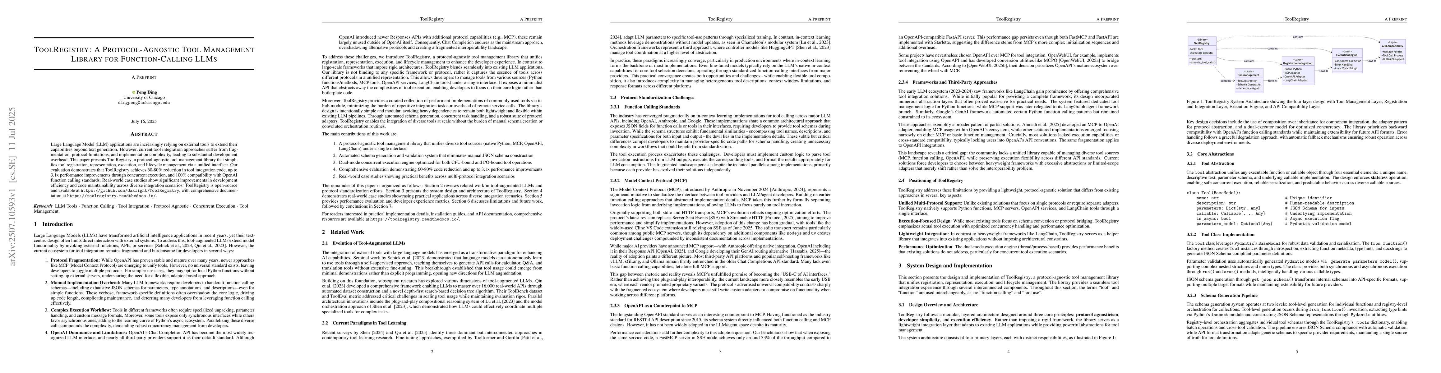ToolRegistry is a protocol-agnostic library that simplifies tool management for Large Language Models, reducing integration code by 60-80%, improving performance up to 3.1x, and ensuring 100% compatibility with OpenAI function calling standards. Real-world applications demonstrate significant development efficiency and code maintainability gains.