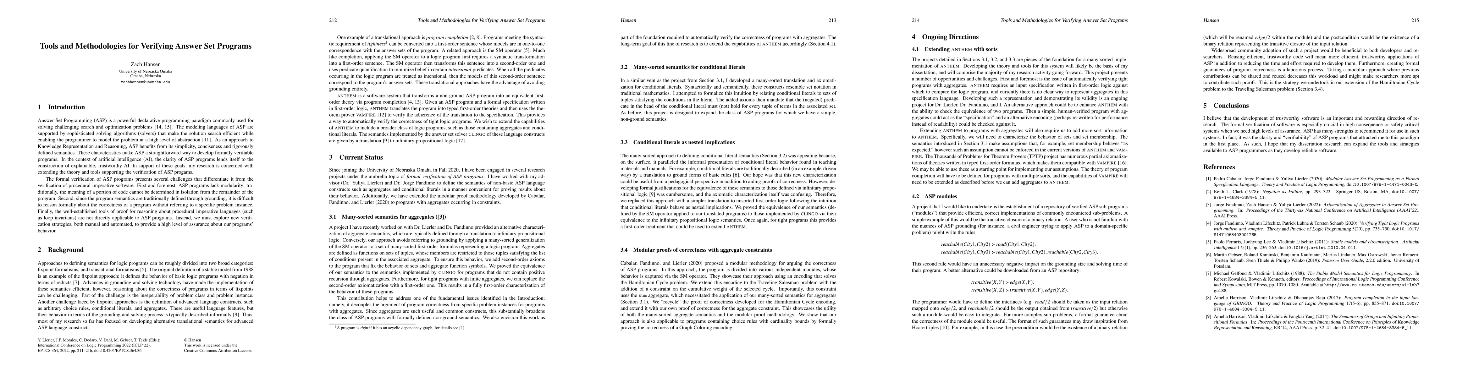 Answer Set Programming (ASP) is a powerful declarative programming paradigm commonly used for solving challenging search and optimization problems. The modeling languages of ASP are supported by sophisticated solving algorithms (solvers) that make the solution search efficient while enabling the programmer to model the problem at a high level of abstraction. As an approach to Knowledge Representation and Reasoning, ASP benefits from its simplicity, conciseness and rigorously defined semantics. These characteristics make ASP a straightforward way to develop formally verifiable programs. In the context of artificial intelligence (AI), the clarity of ASP programs lends itself to the construction of explainable, trustworthy AI. In support of these goals, my research is concerned with extending the theory and tools supporting the verification of ASP progams.