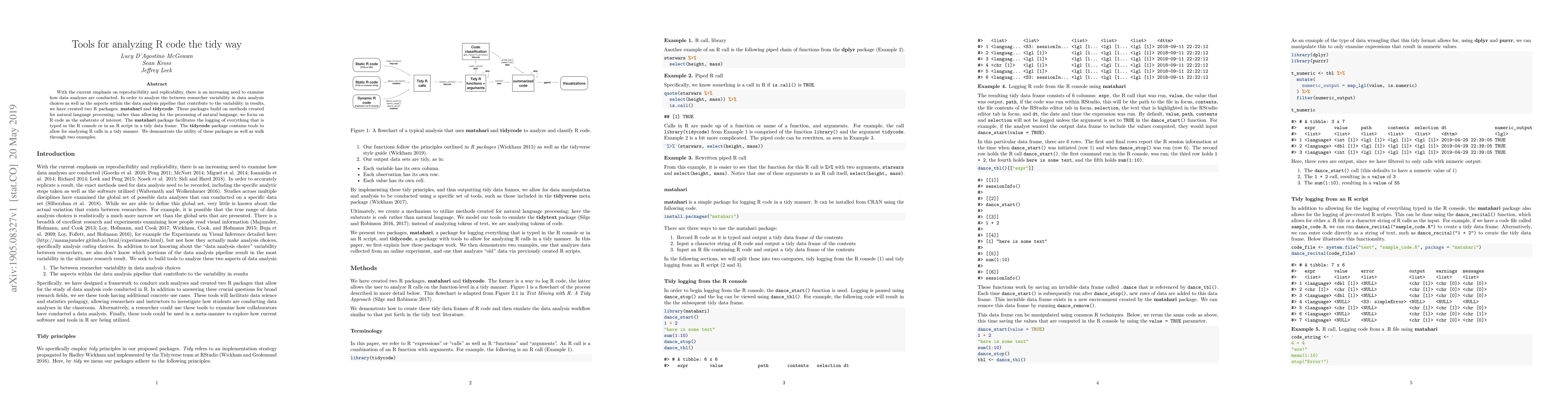 With the current emphasis on reproducibility and replicability, there is an increasing need to examine how data analyses are conducted. In order to analyze the between researcher variability in data analysis choices as well as the aspects within the data analysis pipeline that contribute to the variability in results, we have created two R packages: matahari and tidycode. These packages build on methods created for natural language processing; rather than allowing for the processing of natural language, we focus on R code as the substrate of interest. The matahari package facilitates the logging of everything that is typed in the R console or in an R script in a tidy data frame. The tidycode package contains tools to allow for analyzing R calls in a tidy manner. We demonstrate the utility of these packages as well as walk through two examples.