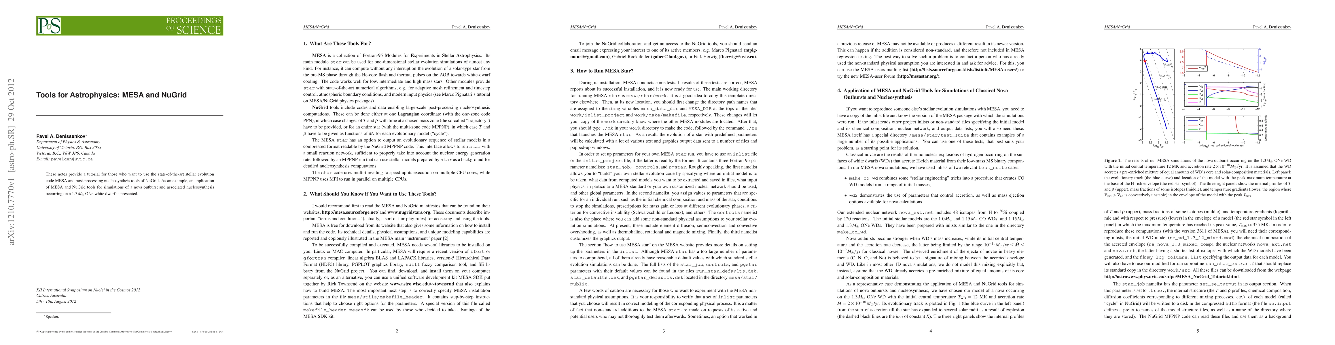 These notes provide a tutorial for those who want to use the state-of-the-art stellar evolution code MESA and post-processing nucleosyntheis tools of NuGrid. As an example, an application of MESA and NuGrid tools for simulations of a nova outburst and associated nucleosynthesis occurring on a 1.3 Msun ONe white dwarf is presented.