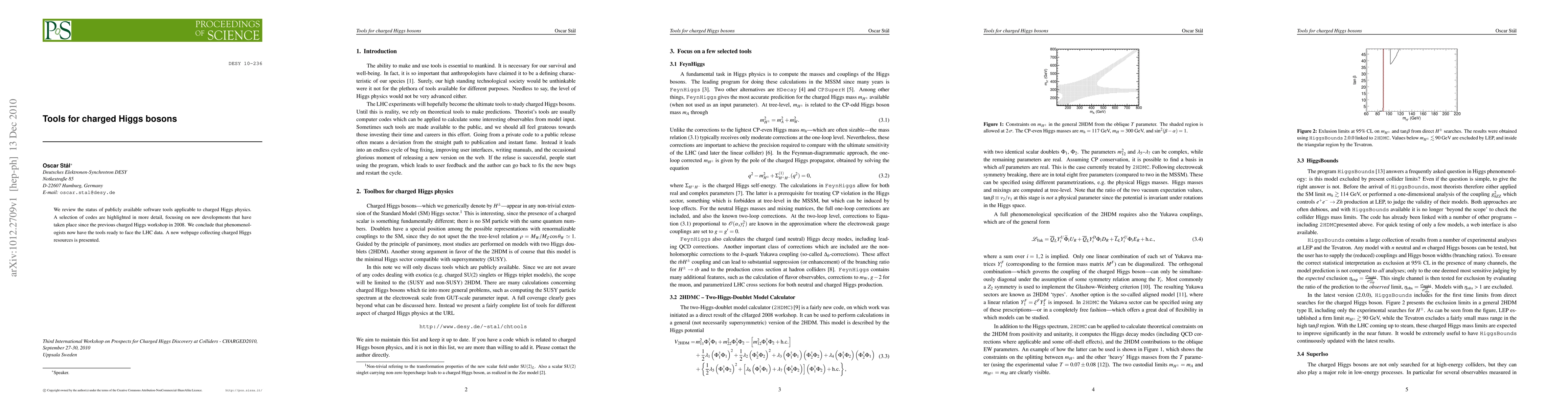We review the status of publicly available software tools applicable to charged Higgs physics. A selection of codes are highlighted in more detail, focusing on new developments that have taken place since the previous charged Higgs workshop in 2008. We conclude that phenomenologists now have the tools ready to face the LHC data. A new webpage collecting charged Higgs resources is presented.