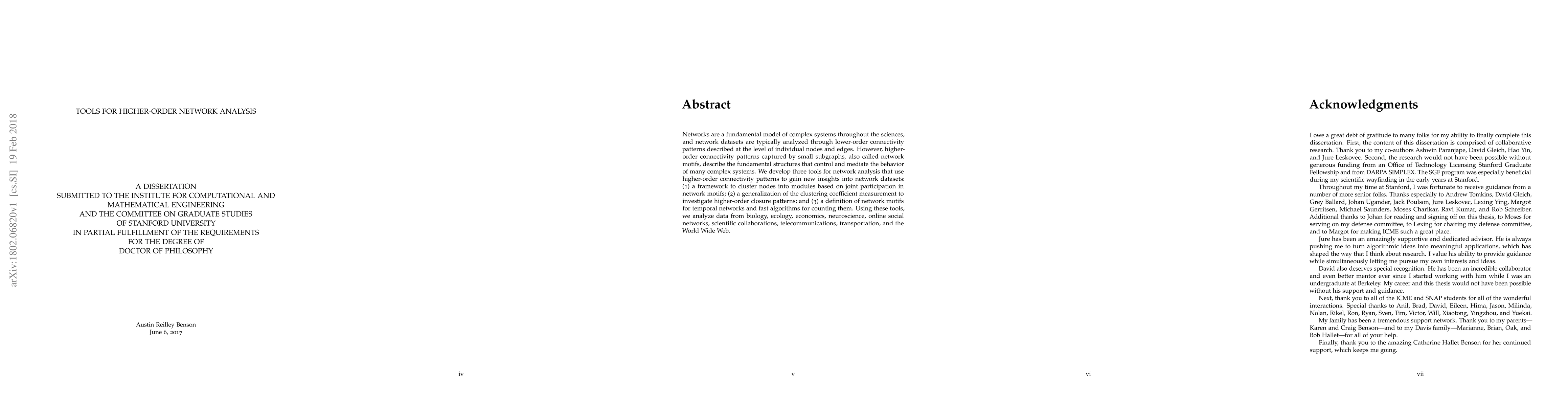 This paper introduces three advanced tools for higher-order network analysis, focusing on small subgraphs or network motifs to uncover deeper structures within complex systems. The tools include a framework for clustering nodes based on motif participation, a generalized clustering coefficient for higher-order patterns, and algorithms for motif counting in temporal networks.