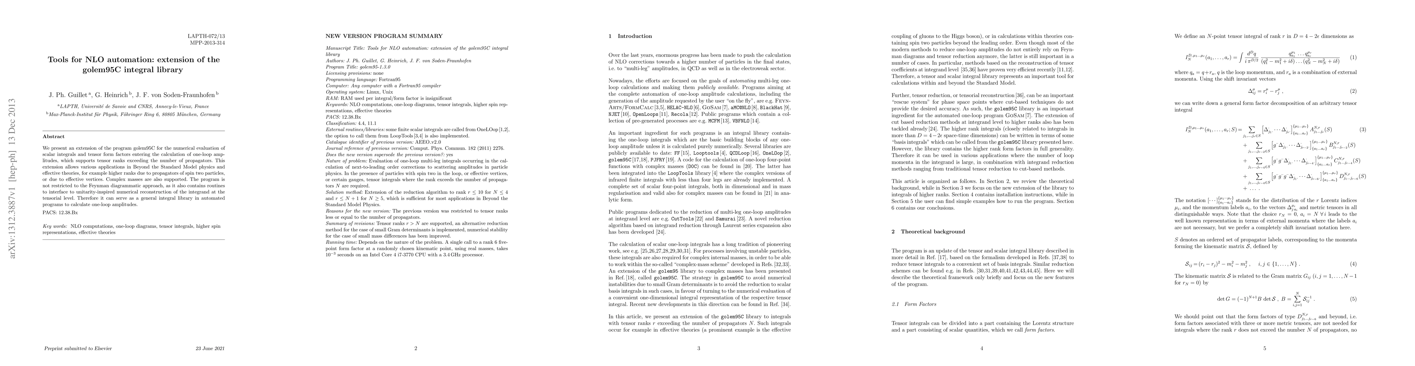 This paper extends the golem95C program to evaluate scalar integrals and tensor form factors for one-loop amplitudes, supporting higher tensor ranks and complex masses. It also interfaces with unitarity-inspired numerical reconstruction, making it a versatile tool for Beyond the Standard Model physics and effective theories.
