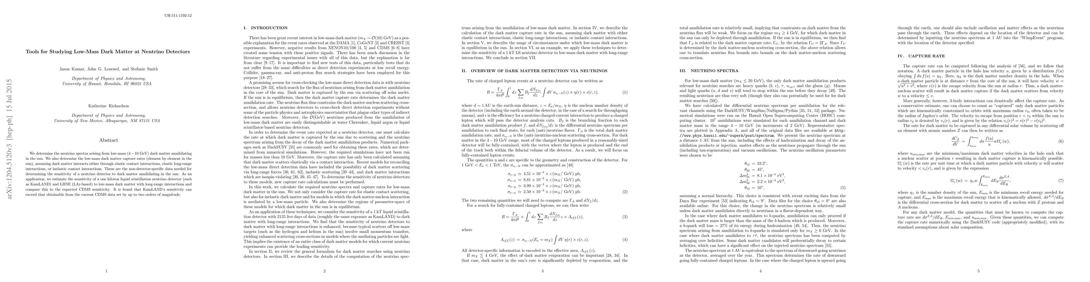 We determine the neutrino spectra arising from low-mass (4-10 GeV) dark matter annihilating in the sun. We also determine the low-mass dark matter capture rates (element by element in the sun), assuming dark matter interacts either through elastic contact interactions, elastic long-range interactions, or inelastic contact interactions. These are the non-detector-specific data needed for determining the sensitivity of a neutrino detector to dark matter annihilating in the sun. As an application, we estimate the sensitivity of a one kiloton liquid scintillation neutrino detector (such as KamLAND) and LBNE (LAr-based) to low-mass dark matter with long-range interactions and compare this to the expected CDMS sensitivity. It is found that KamLAND's sensitivity can exceed that obtainable from the current CDMS data set by up to two orders of magnitude.
