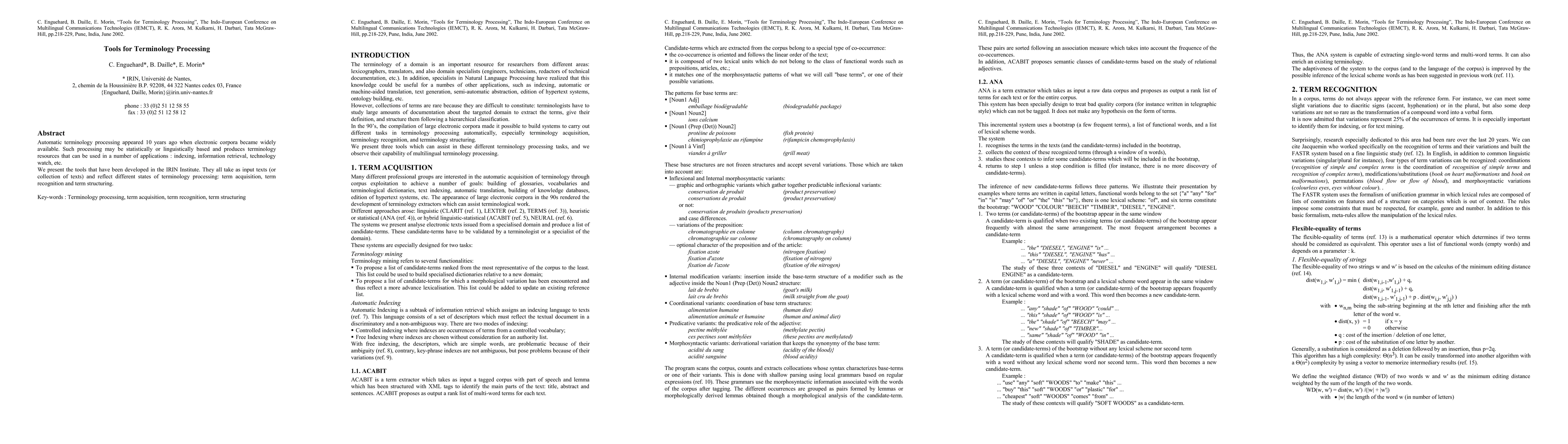 Automatic terminology processing appeared 10 years ago when electronic corpora became widely available. Such processing may be statistically or linguistically based and produces terminology resources that can be used in a number of applications : indexing, information retrieval, technology watch, etc. We present the tools that have been developed in the IRIN Institute. They all take as input texts (or collection of texts) and reflect different states of terminology processing: term acquisition, term recognition and term structuring.