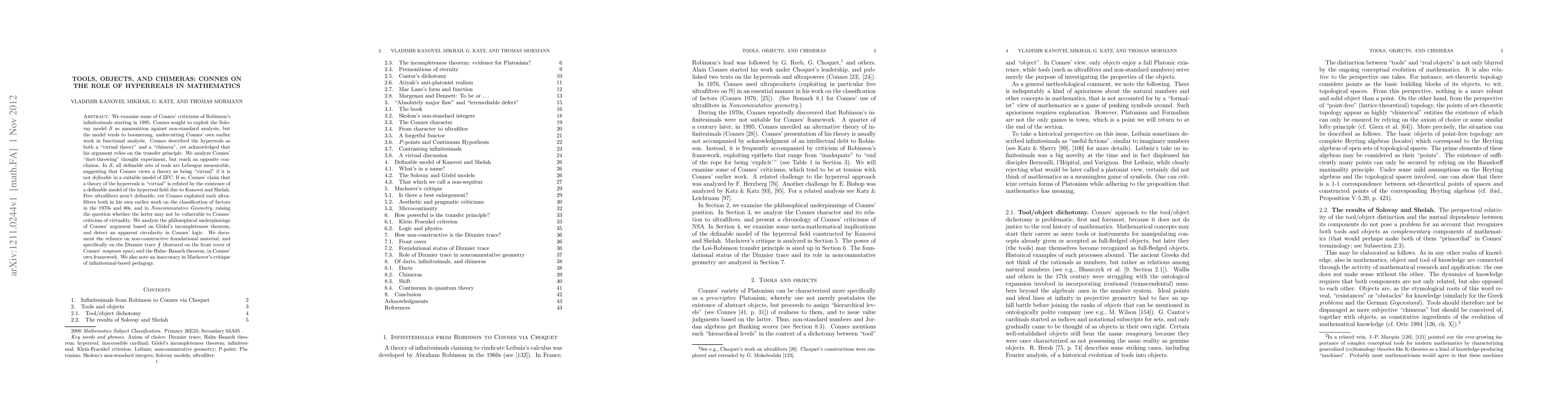 We examine some of Connes' criticisms of Robinson's infinitesimals starting in 1995. Connes sought to exploit the Solovay model S as ammunition against non-standard analysis, but the model tends to boomerang, undercutting Connes' own earlier work in functional analysis. Connes described the hyperreals as both a "virtual theory" and a "chimera", yet acknowledged that his argument relies on the transfer principle. We analyze Connes' "dart-throwing" thought experiment, but reach an opposite conclusion. In S, all definable sets of reals are Lebesgue measurable, suggesting that Connes views a theory as being "virtual" if it is not definable in a suitable model of ZFC. If so, Connes' claim that a theory of the hyperreals is "virtual" is refuted by the existence of a definable model of the hyperreal field due to Kanovei and Shelah. Free ultrafilters aren't definable, yet Connes exploited such ultrafilters both in his own earlier work on the classification of factors in the 1970s and 80s, and in his Noncommutative Geometry, raising the question whether the latter may not be vulnerable to Connes' criticism of virtuality. We analyze the philosophical underpinnings of Connes' argument based on Goedel's incompleteness theorem, and detect an apparent circularity in Connes' logic. We document the reliance on non-constructive foundational material, and specifically on the Dixmier trace (featured on the front cover of Connes' magnum opus) and the Hahn-Banach theorem, in Connes' own framework. We also note an inaccuracy in Machover's critique of infinitesimal-based pedagogy.