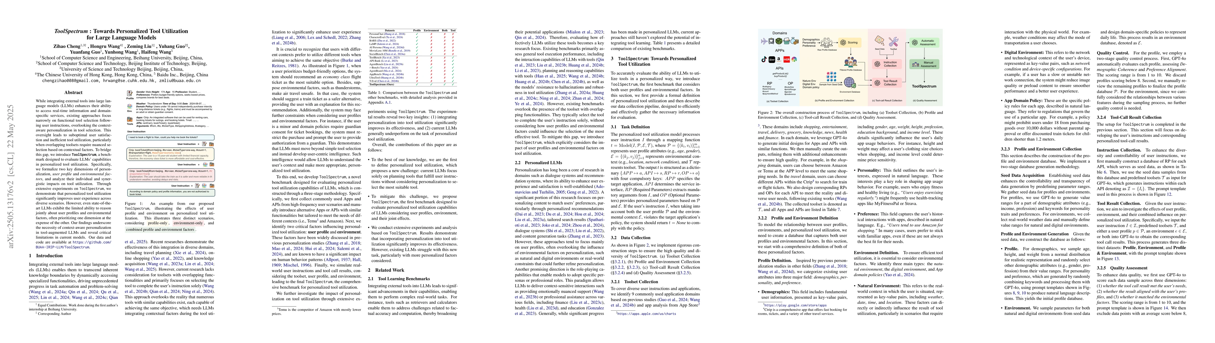 ToolSpectrum, a benchmark for evaluating personalized tool utilization in LLMs, formalizing user profile and environmental factors as key dimensions.