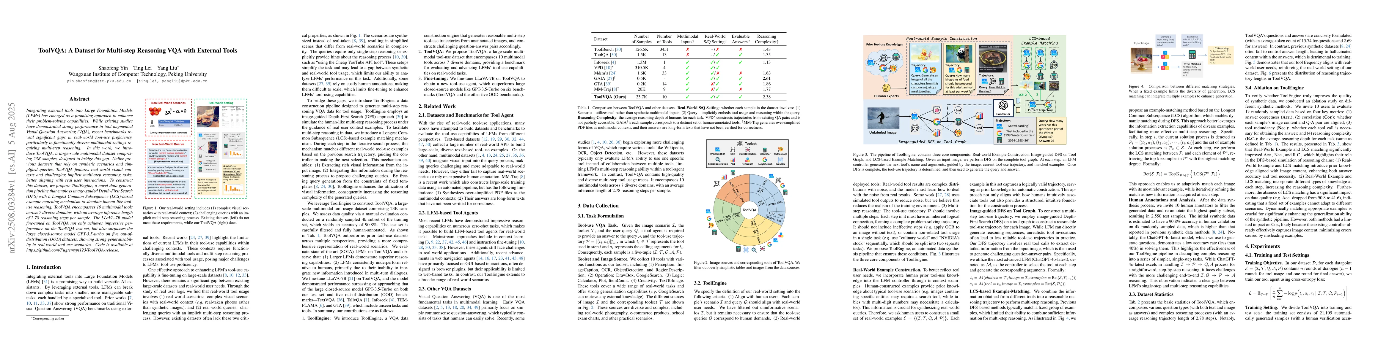 Integrating external tools into Large Foundation Models (LFMs) has emerged as a promising approach to enhance their problem-solving capabilities. While existing studies have demonstrated strong performance in tool-augmented Visual Question Answering (VQA), recent benchmarks reveal significant gaps in real-world tool-use proficiency, particularly in functionally diverse multimodal settings requiring multi-step reasoning. In this work, we introduce ToolVQA, a large-scale multimodal dataset comprising 23K instances, designed to bridge this gap. Unlike previous datasets that rely on synthetic scenarios and simplified queries, ToolVQA features real-world visual contexts and challenging implicit multi-step reasoning tasks, better aligning with real user interactions. To construct this dataset, we propose ToolEngine, a novel data generation pipeline that employs Depth-First Search (DFS) with a dynamic in-context example matching mechanism to simulate human-like tool-use reasoning. ToolVQA encompasses 10 multimodal tools across 7 diverse task domains, with an average inference length of 2.78 reasoning steps per instance. The fine-tuned 7B LFMs on ToolVQA not only achieve impressive performance on our test set but also surpass the large close-sourced model GPT-3.5-turbo on various out-of-distribution (OOD) datasets, demonstrating strong generalizability to real-world tool-use scenarios.