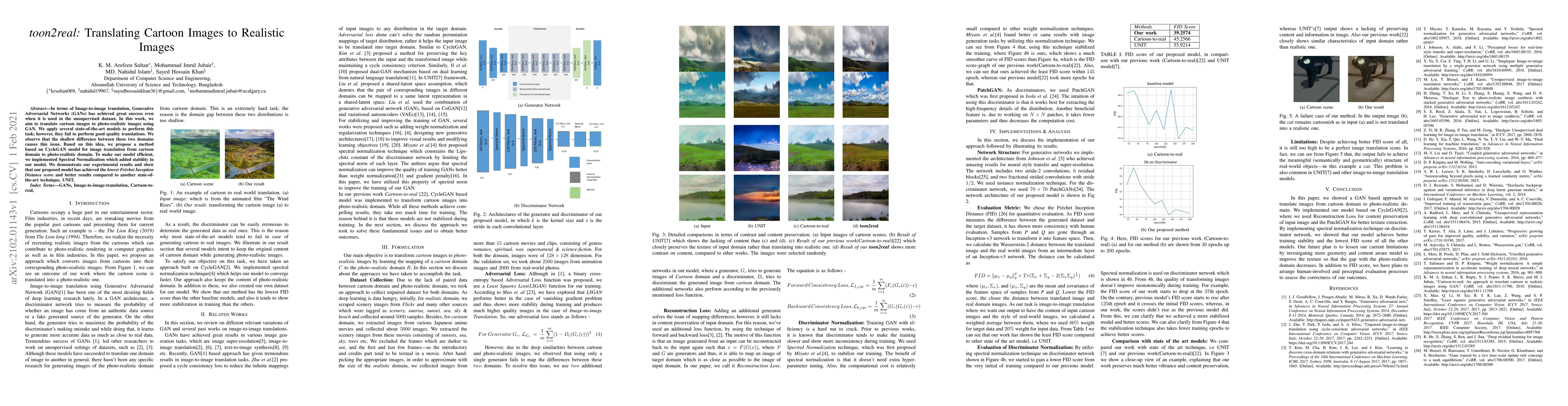 This paper presents 'toon2real', a method using CycleGAN with Spectral Normalization to translate cartoon images into realistic photos, outperforming existing techniques like UNIT as per Frechet Inception Distance scores.
