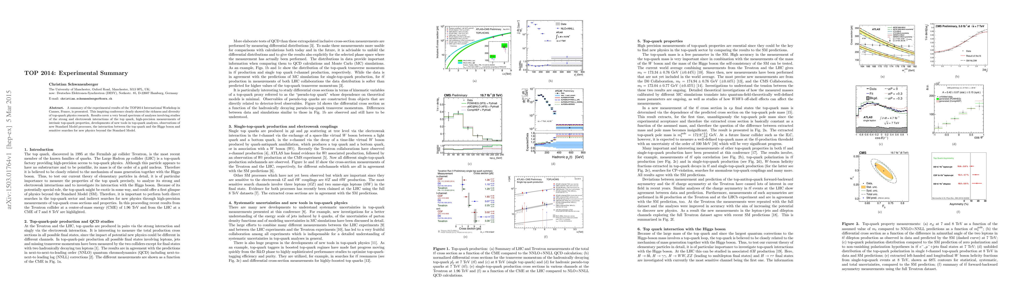 A summary of the experimental results of the TOP2014 International Workshop in Cannes, France, is presented. This inspiring conference clearly showed the richness and diversity of top-quark physics research. Results cover a very broad spectrum of analyses involving studies of the strong and electroweak interactions of the top quark, high-precision measurements of intrinsic top-quark properties, developments of new tools in top-quark analyses, observations of new Standard Model processes, the interaction between the top quark and the Higgs boson and sensitive searches for new physics beyond the Standard Model.