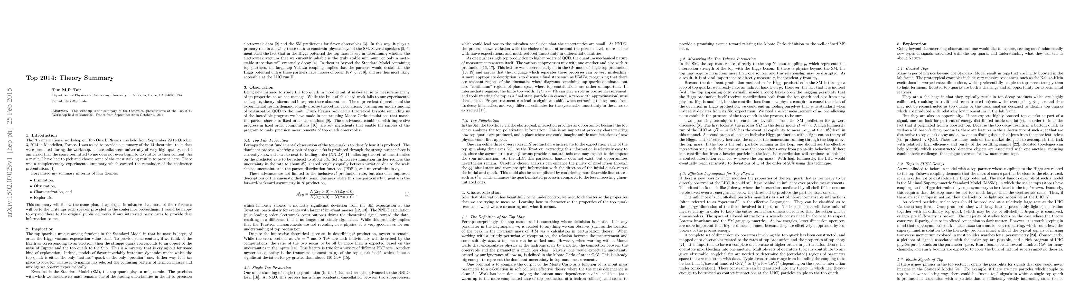 This paper summarizes the key theoretical presentations from the Top 2014 Workshop held in Mandelieu, France, from September 29 to October 3, 2014, highlighting significant advancements and discussions in theoretical research.
