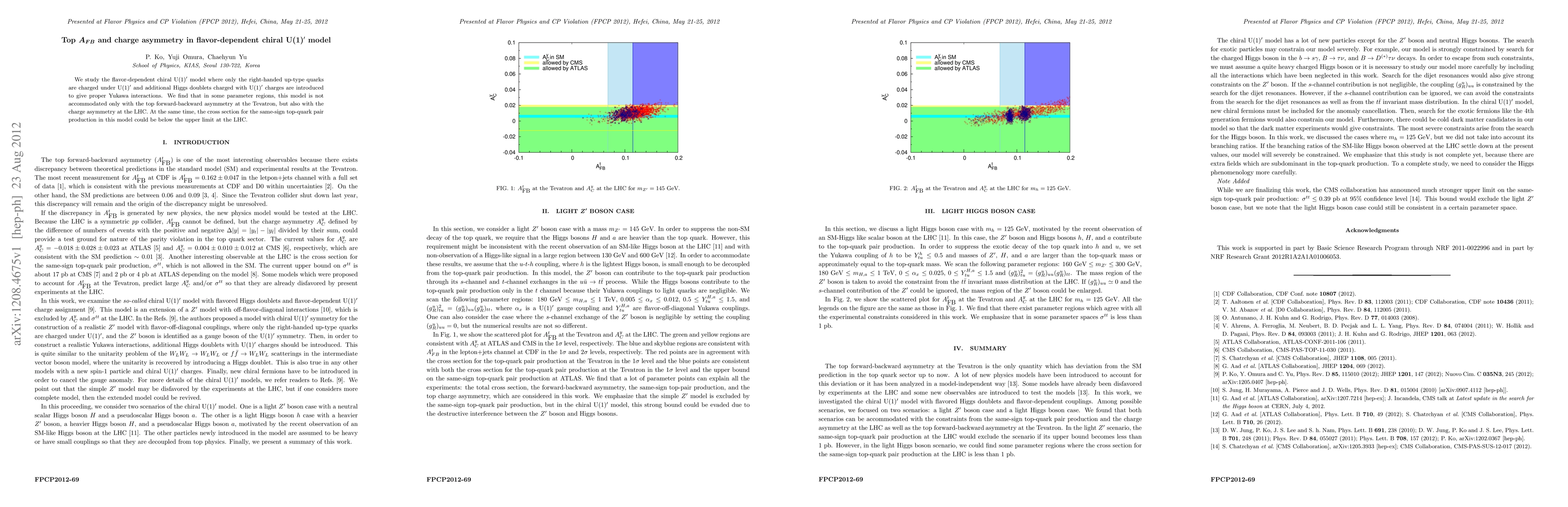 This paper explores a flavor-dependent chiral U(1)' model with right-handed up-type quarks and additional Higgs doublets, finding that it can simultaneously explain top forward-backward asymmetry at the Tevatron and charge asymmetry at the LHC, while keeping same-sign top-quark pair production within experimental limits.