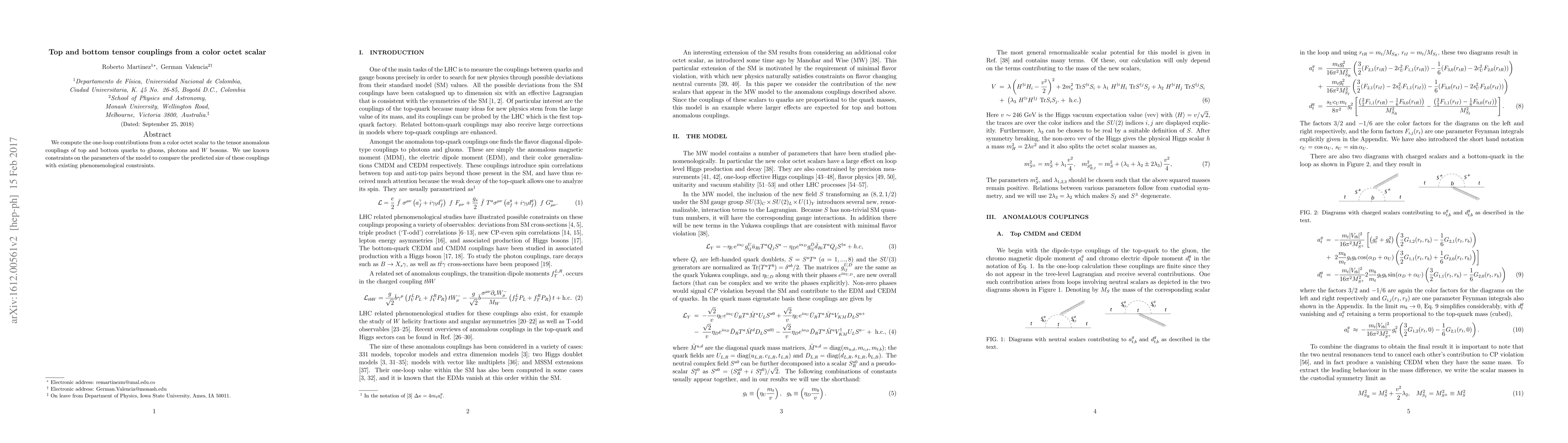 We compute the one-loop contributions from a color octet scalar to the tensor anomalous couplings of top and bottom quarks to gluons, photons and W bosons. We use known constraints on the parameters of the model to compare the predicted size of these couplings with existing phenomenological constraints.