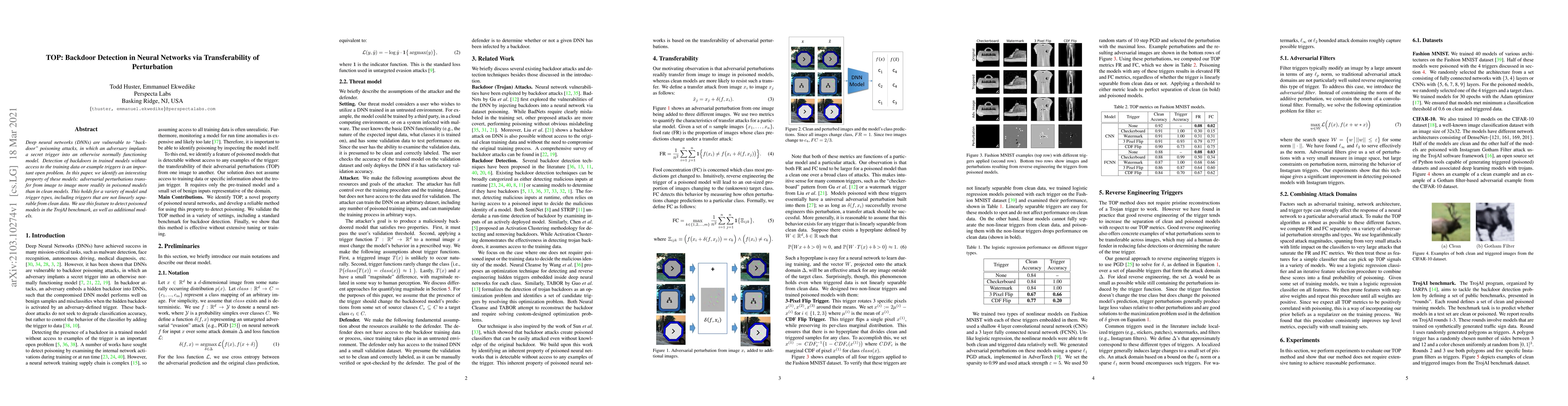 Researchers found that adversarial perturbations can transfer more easily from image to image in models with backdoors compared to clean models. This property is used to detect poisoned models without access to training data or triggers.
