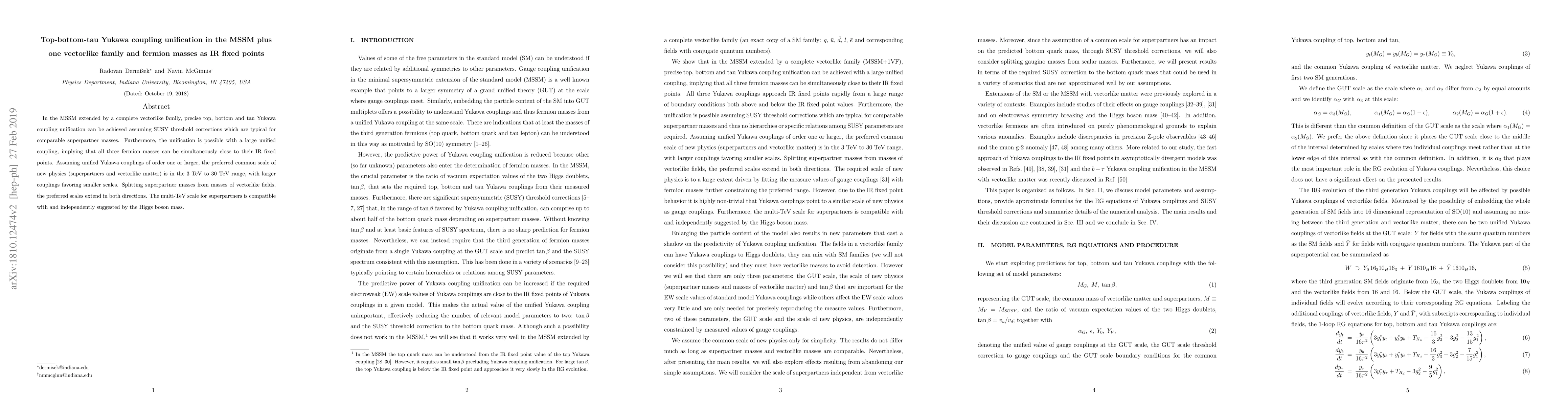 This paper explores Yukawa coupling unification in the MSSM augmented by a vectorlike family, showing precise unification of top, bottom, and tau Yukawa couplings with large unified couplings. The preferred new physics scale is in the 3-30 TeV range, with implications for superpartner and vectorlike matter masses.