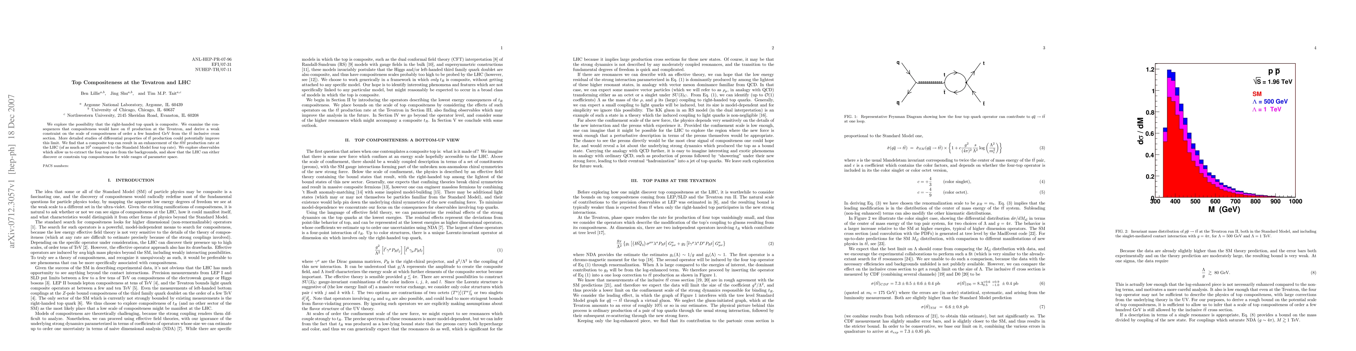 This paper investigates the potential compositeness of the right-handed top quark and its implications for $t \bar{t}$ production at the Tevatron and LHC. It derives a compositeness scale constraint of a few hundred GeV and suggests that LHC could significantly enhance the $t \bar{t} t \bar{t}$ production rate, offering a means to discover or constrain top compositeness.
