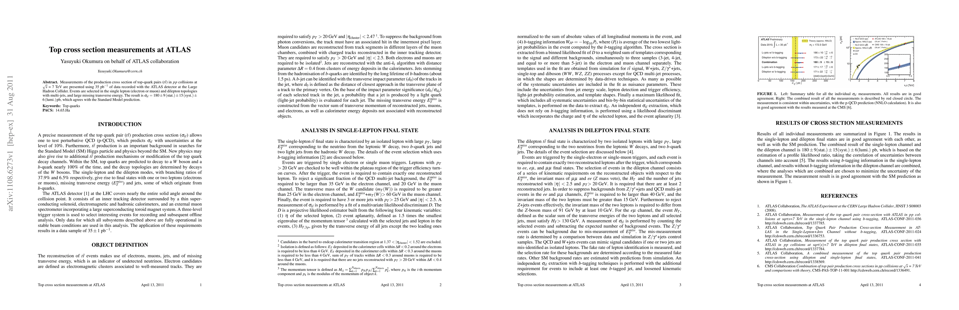 The ATLAS collaboration reports a measurement of the top-quark pair production cross section at 7 TeV, yielding $\sigma_{t\bar t} = 180 \pm 9\,\mathrm{(stat.)} \pm 15 \,\mathrm{(syst.)} \pm 6 \,\mathrm{(lumi.)}\,\mathrm{pb}$, consistent with Standard Model predictions.