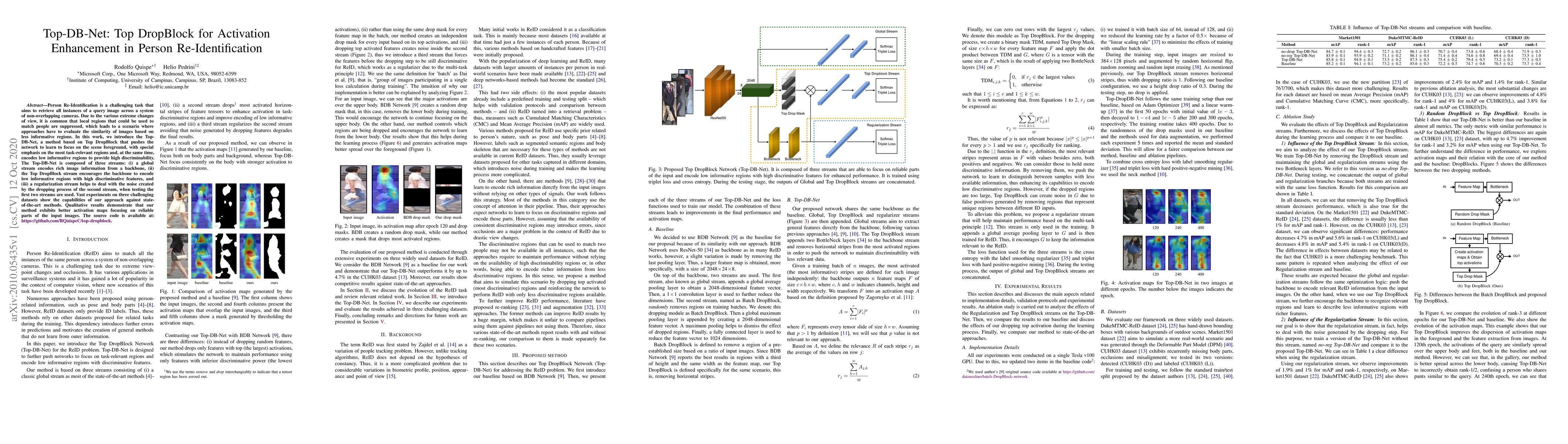 A new method called Top-DB-Net is introduced to improve person re-identification by focusing on task-relevant regions and encoding low informative regions for high discriminability.
