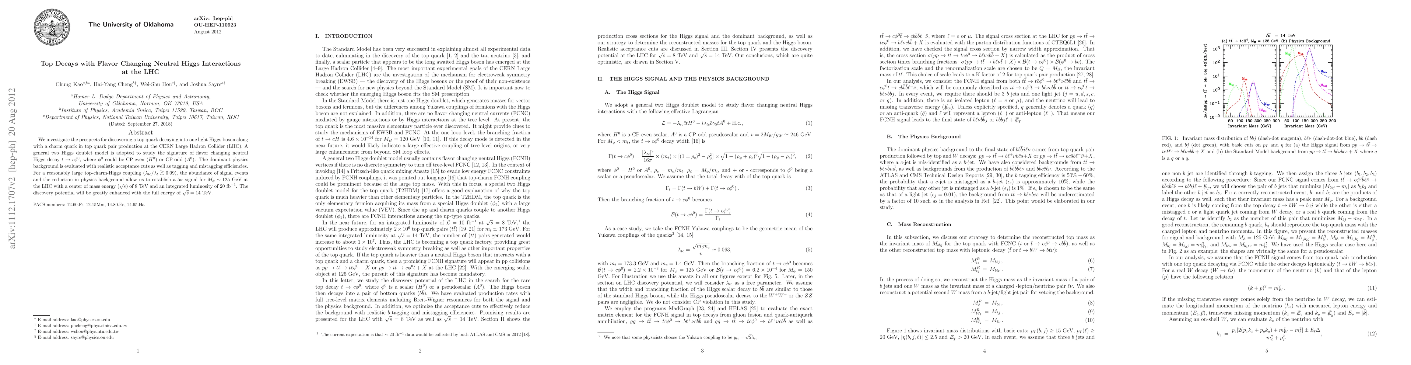 We investigate the prospects for discovering a top quark decaying into one light Higgs boson along with a charm quark in top quark pair production at the CERN Large Hadron Collider (LHC). A general two Higgs doublet model is adopted to study the signature of flavor changing neutral Higgs decay $t \to c\phi^0$, %or $\bar{t} \to \bar{c}\phi^0$ where $\phi^0$ could be CP-even ($H^0$) or CP-odd ($A^0$). The dominant physics background is evaluated with realistic acceptance cuts as well as tagging and mistagging efficiencies. For a reasonably large top-charm-Higgs coupling ($\lambda_{tc}/\lambda_{t} \agt 0.09$), the abundance of signal events and the %that our acceptance cuts reduction in physics background allow us to establish a $5\sigma$ signal for $M_\phi \sim 125$ GeV at the LHC with a center of mass energy ($\sqrt{s}$) of 8 TeV and an integrated luminosity of 20 fb$^{-1}$. The discovery potential will be greatly enhanced with the full energy of $\sqrt{s} = 14$ TeV.