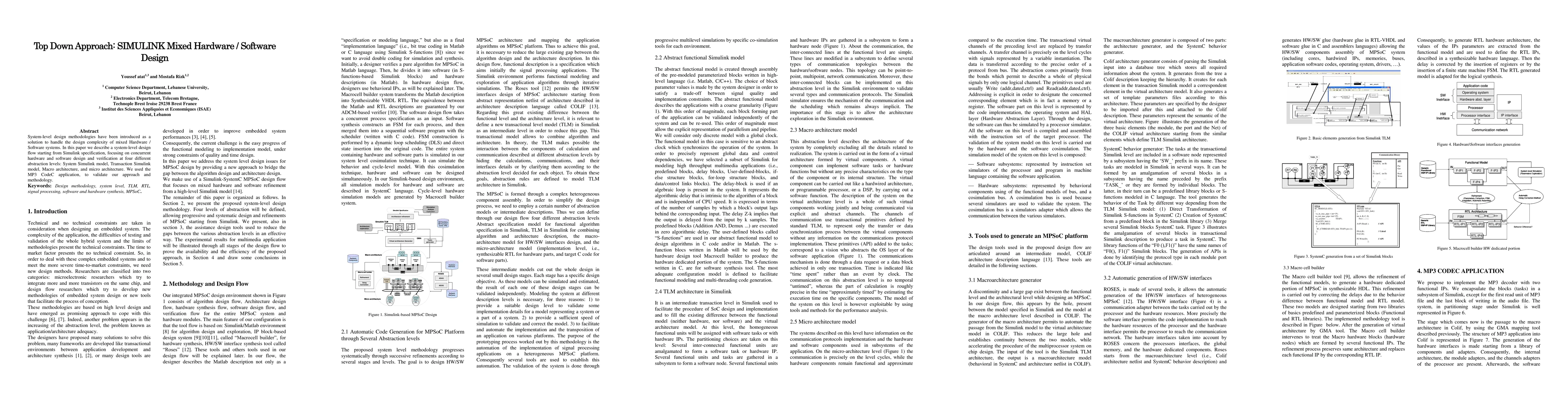 This paper outlines a top-down design methodology for mixed hardware/software systems using Simulink, emphasizing concurrent design and verification across four abstraction levels. The approach is validated using an MP3 CodeC application.