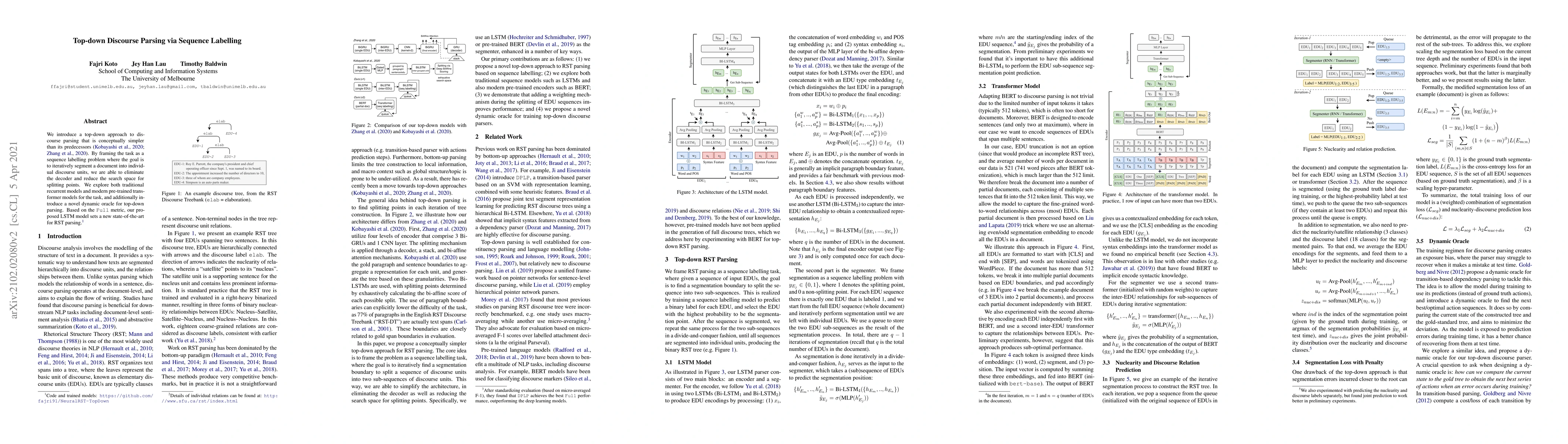 This paper presents a top-down discourse parsing method framed as a sequence labelling problem, achieving higher accuracy by eliminating the decoder and reducing search space. The approach utilizes both recurrent and transformer models, with the LSTM model setting a new state-of-the-art in RST parsing based on the Full metric.