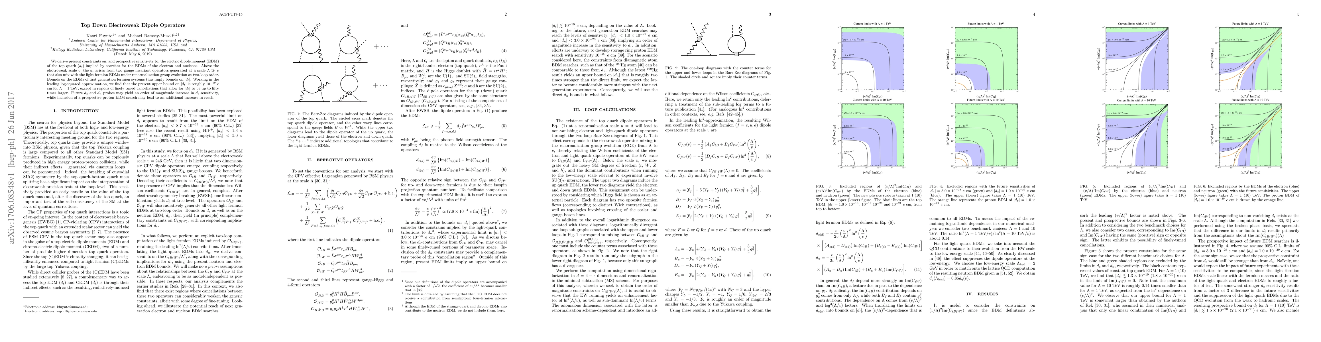 We derive present constraints on, and prospective sensitivity to, the electric dipole moment (EDM) of the top quark ($d_t$) implied by searches for the EDMs of the electron and nucleons. Above the electroweak scale $v$, the $d_t$ arises from two gauge invariant operators generated at a scale $\Lambda \gg v$ that also mix with the light fermion EDMs under renormalization group evolution at two-loop order. Bounds on the EDMs of first generation fermion systems thus imply bounds on $|d_t|$. Working in the leading log-squared approximation, we find that the present upper bound on $|d_t|$ is roughly $10^{-19}$ $e$ cm for $\Lambda = 1$ TeV, except in regions of finely tuned cancellations that allow for $|d_t|$ to be up to fifty times larger. Future $d_e$ and $d_n$ probes may yield an order of magnitude increase in $d_t$ sensitivity, while inclusion of a prospective proton EDM search may lead to an additional increase in reach.