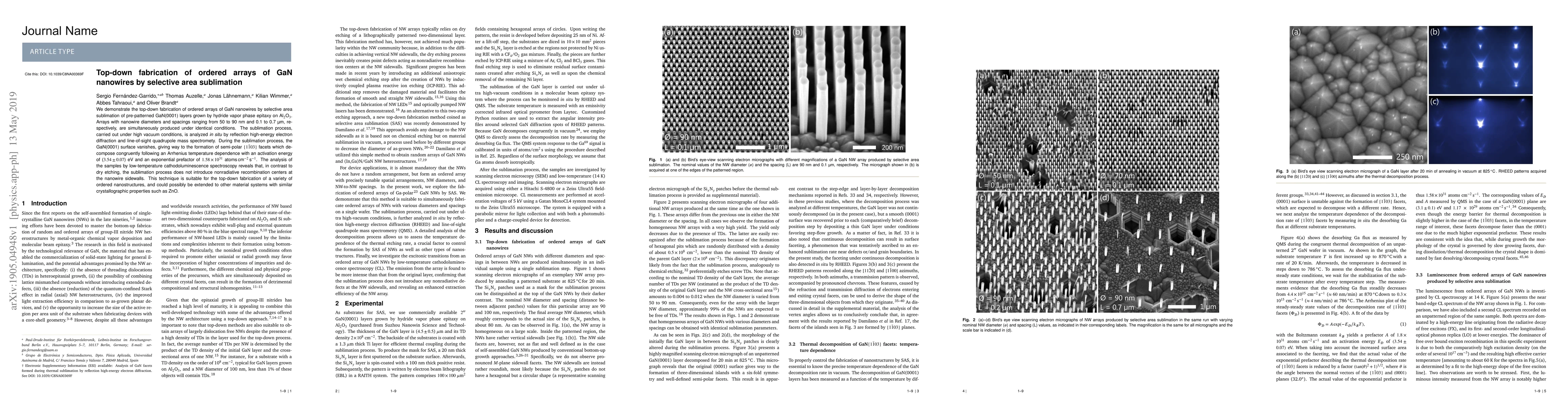This paper details the top-down fabrication of ordered GaN nanowire arrays via selective area sublimation, achieving precise control over nanowire diameters and spacings. The sublimation process, analyzed in situ, reveals the formation of semi-polar facets without introducing nonradiative recombination centers, making it a promising technique for creating various ordered nanostructures.