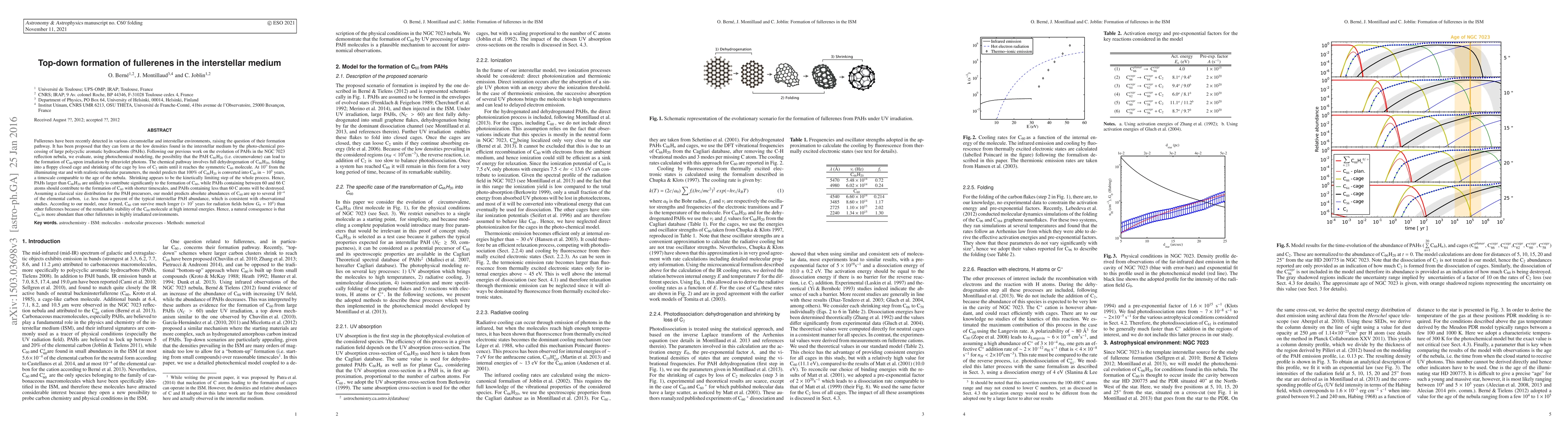 [Abridged] Fullerenes have been recently detected in various circumstellar and interstellar environments, raising the question of their formation pathway. It has been proposed that they can form by the photo-chemical processing of large polycyclic aromatic hydrocarbons (PAHs). Following our previous work on the evolution of PAHs in the NGC 7023 reflection nebula, we evaluate, using photochemical modeling, the possibility that the PAH C$_{66}$H$_{20}$ (i.e. circumovalene) can lead to the formation of C$_{60}$ upon irradiation by ultraviolet photons. The chemical pathway involves full dehydrogenation, folding into a floppy closed cage and shrinking of the cage by loss of C$_2$ units until it reaches the symmetric C$_{60}$ molecule. At 10" from the illuminating star and with realistic molecular parameters, the model predicts that 100% of C$_{66}$H$_{20}$ is converted into C$_{60}$ in $\sim$ 10$^5$ years, a timescale comparable to the age of the nebula. Shrinking appears to be the kinetically limiting step of the whole process. Hence, PAHs larger than C$_{66}$H$_{20}$ are unlikely to contribute significantly to the formation of C$_{60}$, while PAHs containing between 60 and 66 C atoms should contribute to the formation of C$_{60}$ with shorter timescales, and PAHs containing less than 60 C atoms will be destroyed. Assuming a classical size distribution for the PAH precursors, our model predicts absolute abundances of C$_{60}$ are up to several $10^{-4}$ of the elemental carbon, i.e. less than a percent of the typical interstellar PAH abundance, which is consistent with observational studies. According to our model, once formed, C$_{60}$ can survive much longer than other fullerenes because of the remarkable stability of the C$_{60}$ molecule at high internal energies.Hence, a natural consequence is that C$_{60}$ is more abundant than other fullerenes in highly irradiated environments.