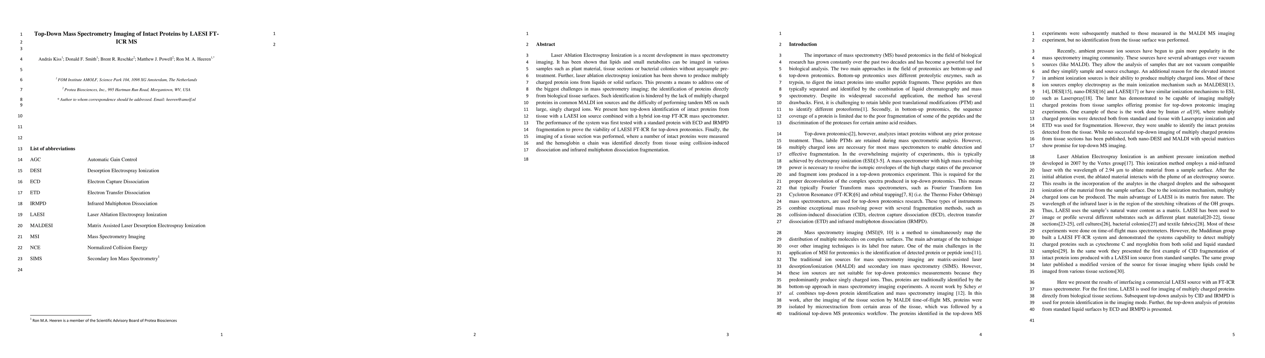 This paper demonstrates the use of Laser Ablation Electrospray Ionization (LAESI) FT-ICR MS for top-down mass spectrometry imaging of intact proteins directly from tissue sections, overcoming limitations of traditional MALDI methods. The system successfully identified the hemoglobin α chain from tissue using collision-induced and infrared multiphoton dissociation fragmentation.