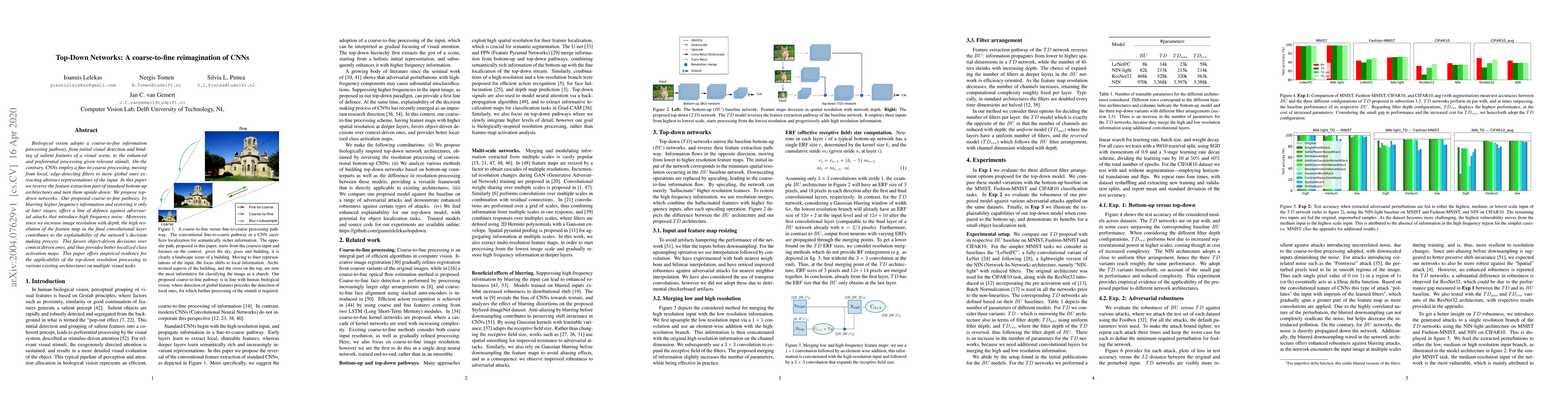 Biological vision adopts a coarse-to-fine information processing pathway, from initial visual detection and binding of salient features of a visual scene, to the enhanced and preferential processing given relevant stimuli. On the contrary, CNNs employ a fine-to-coarse processing, moving from local, edge-detecting filters to more global ones extracting abstract representations of the input. In this paper we reverse the feature extraction part of standard bottom-up architectures and turn them upside-down: We propose top-down networks. Our proposed coarse-to-fine pathway, by blurring higher frequency information and restoring it only at later stages, offers a line of defence against adversarial attacks that introduce high frequency noise. Moreover, since we increase image resolution with depth, the high resolution of the feature map in the final convolutional layer contributes to the explainability of the network's decision making process. This favors object-driven decisions over context driven ones, and thus provides better localized class activation maps. This paper offers empirical evidence for the applicability of the top-down resolution processing to various existing architectures on multiple visual tasks.