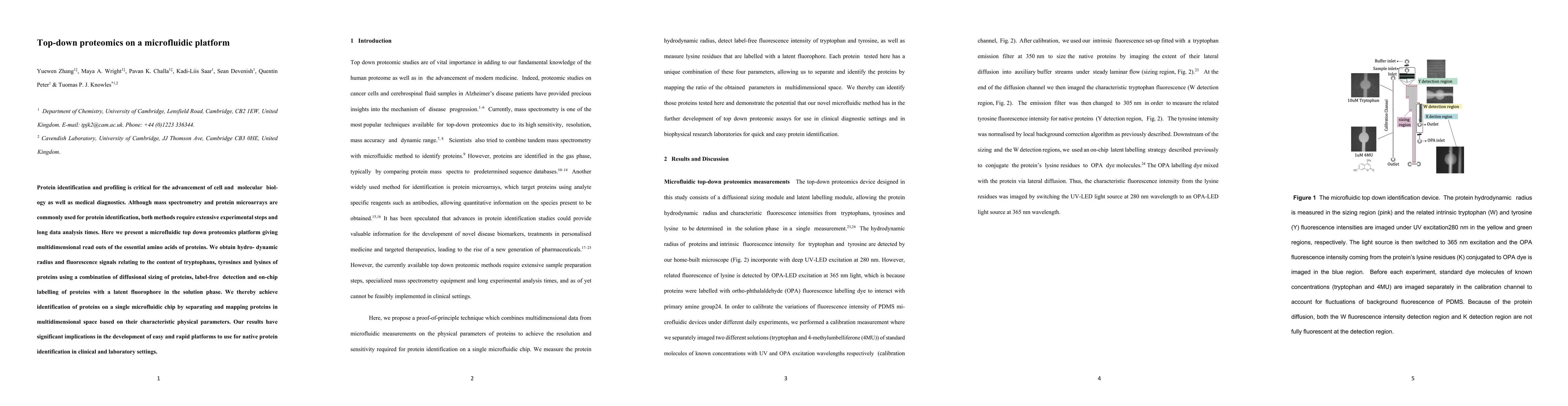 Protein identification and profiling is critical for the advancement of cell and molecular biology as well as medical diagnostics. Although mass spectrometry and protein microarrays are commonly used for protein identification, both methods require extensive experimental steps and long data analysis times. Here we present a microfluidic top down proteomics platform giving multidimensional read outs of the essential amino acids of proteins. We obtain hydrodynamic radius and fluorescence signals relating to the content of tryptophans, tyrosines and lysines of proteins using a combination of diffusional sizing of proteins, label-free detection and on-chip labelling of proteins with a latent fluorophore in the solution phase. We thereby achieve identification of proteins on a single microfluidic chip by separating and mapping proteins in multidimensional space based on their characteristic physical parameters. Our results have significant implications in the development of easy and rapid platforms to use for native protein identification in clinical and laboratory settings.