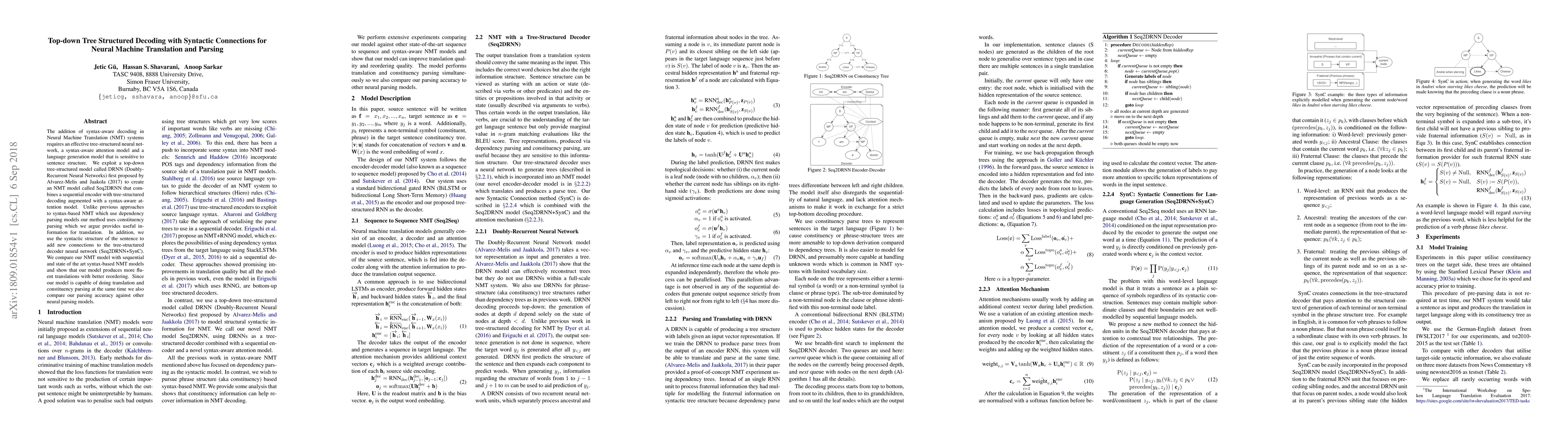 This research proposes a top-down tree-structured decoding method, Seq2DRNN+SynC, for Neural Machine Translation that integrates constituency parsing for improved fluency and reordering, achieving better translation and parsing accuracy compared to sequential and other syntax-based NMT models.
