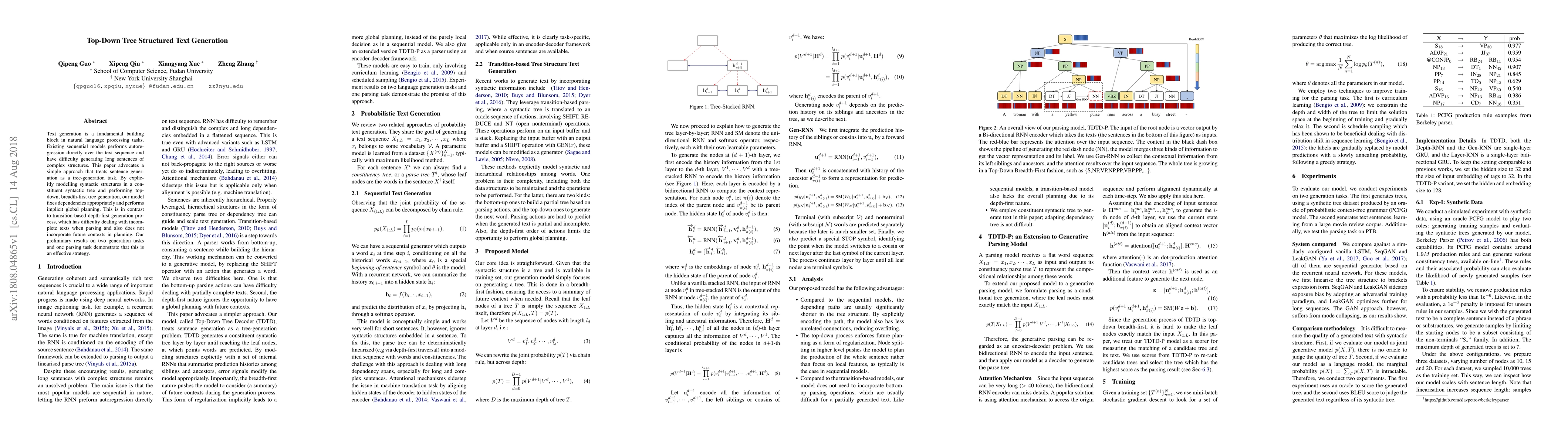 This paper proposes a top-down tree-structured approach for text generation, explicitly modeling syntactic structures in a constituent tree to fix dependencies and perform implicit global planning. Preliminary results show effectiveness over traditional sequential models in generating complex sentences.